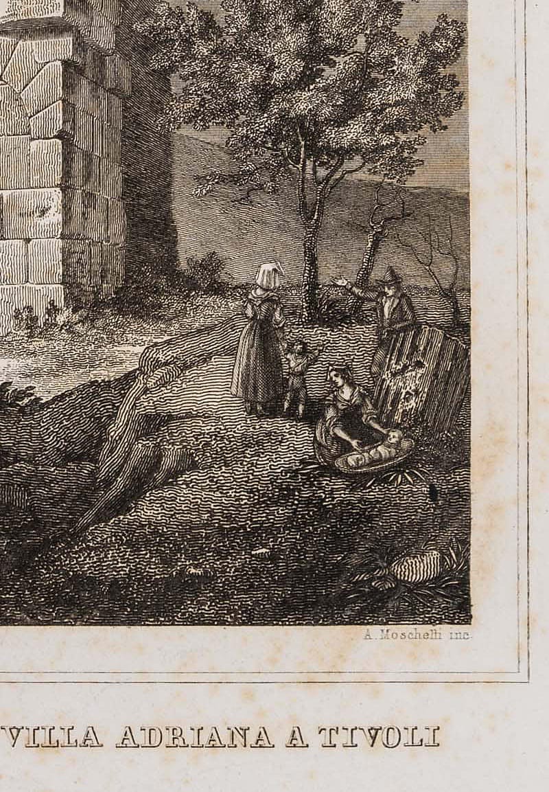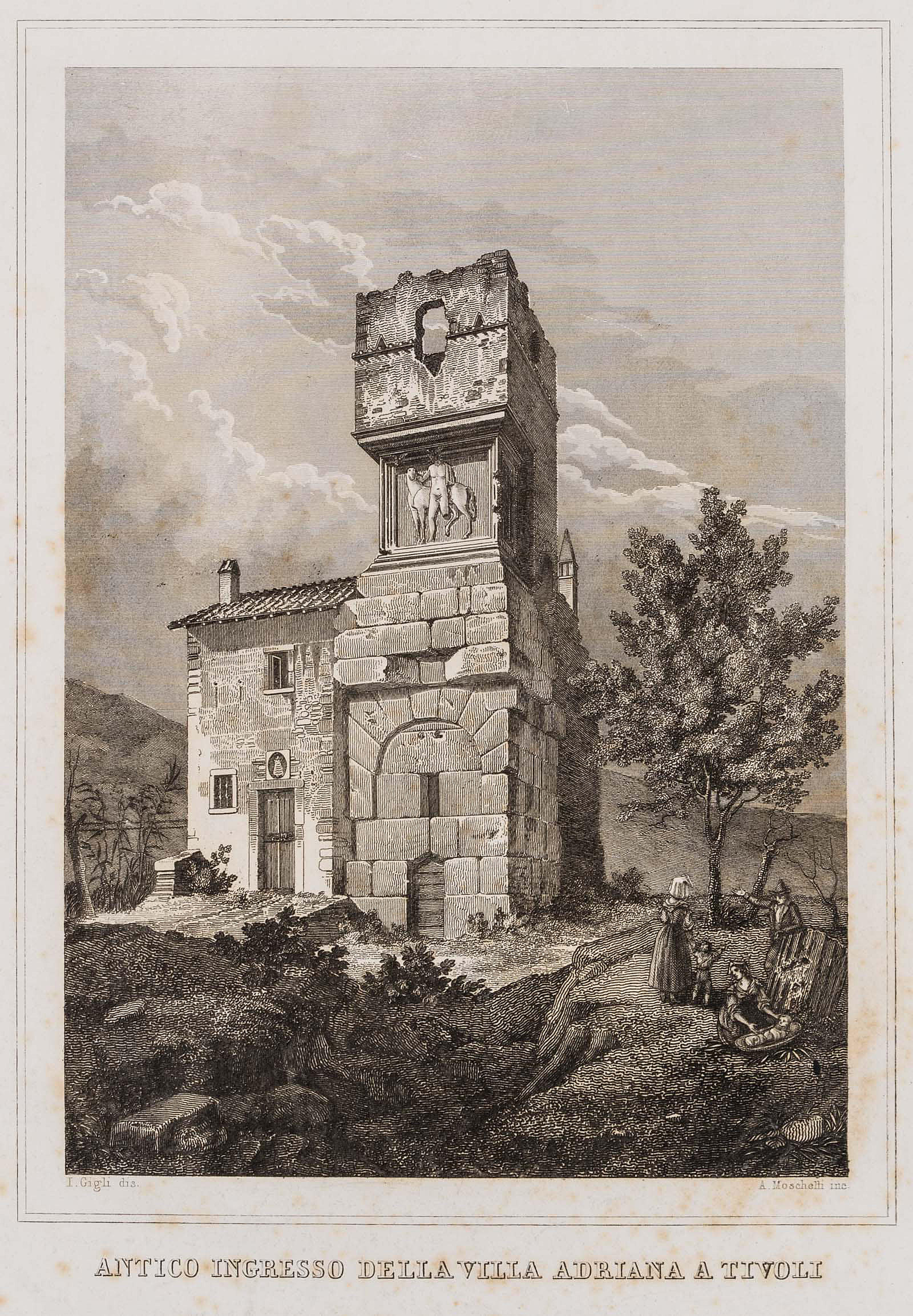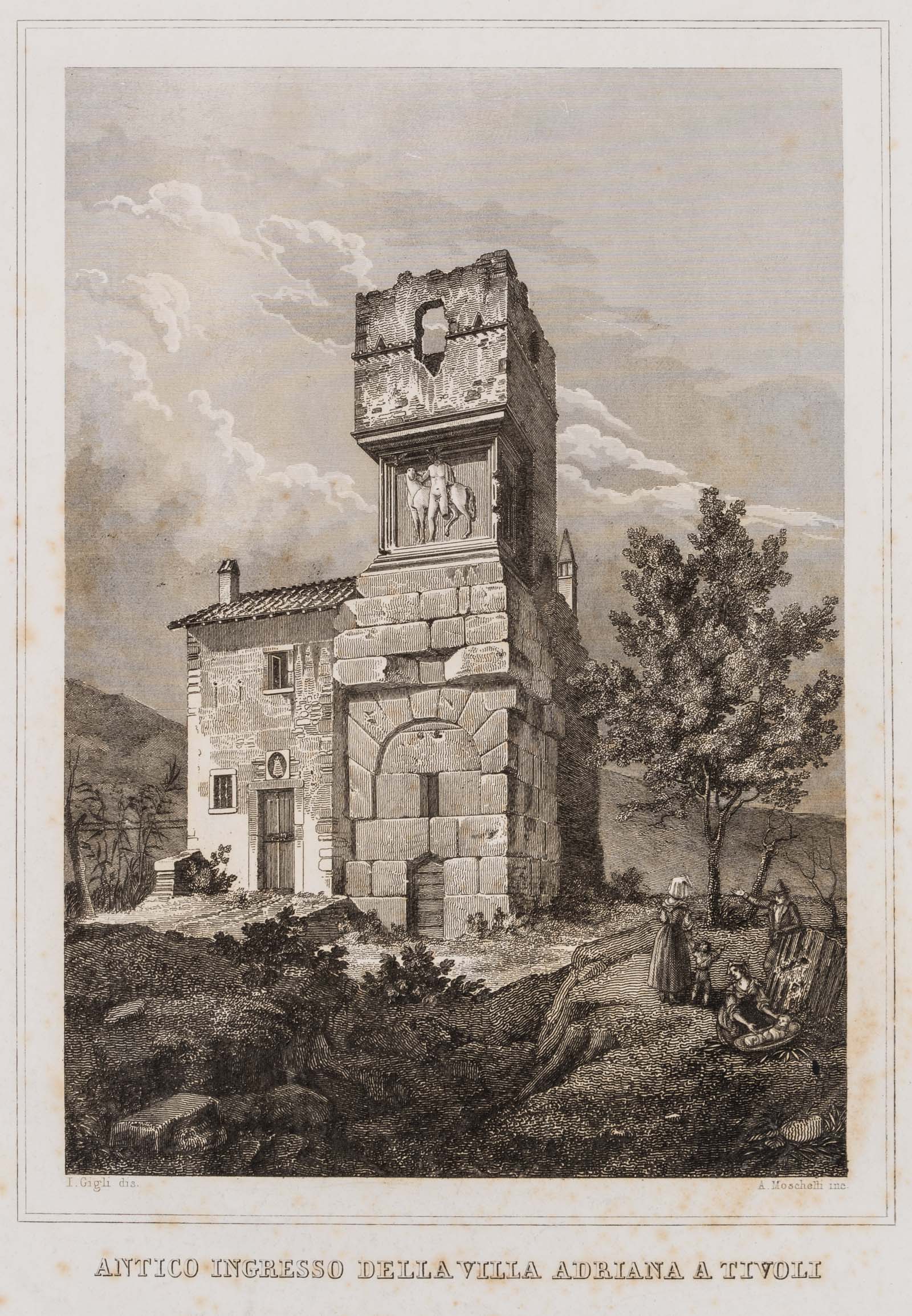 - Inscription: At the lower part signed in the printing plate: “I. Gigli dis / A. Moschetti inc.”. Lower middle inscribed in the printing plate: “Antico Ingresso Della Villa Adriana A Tivoli”.