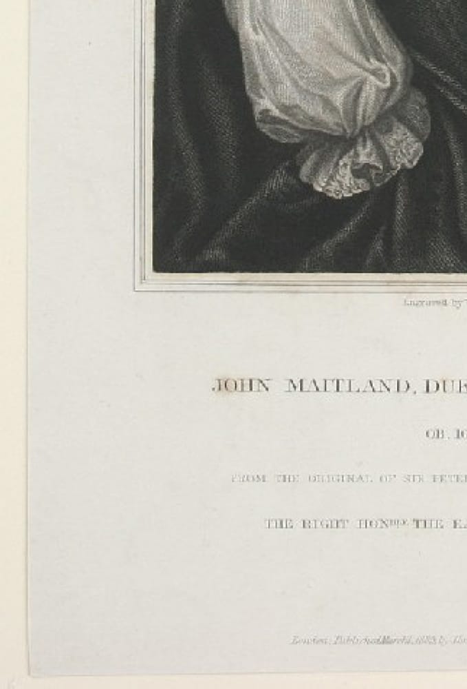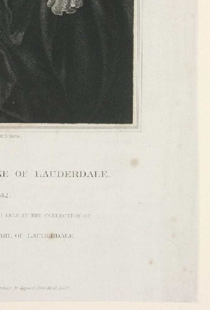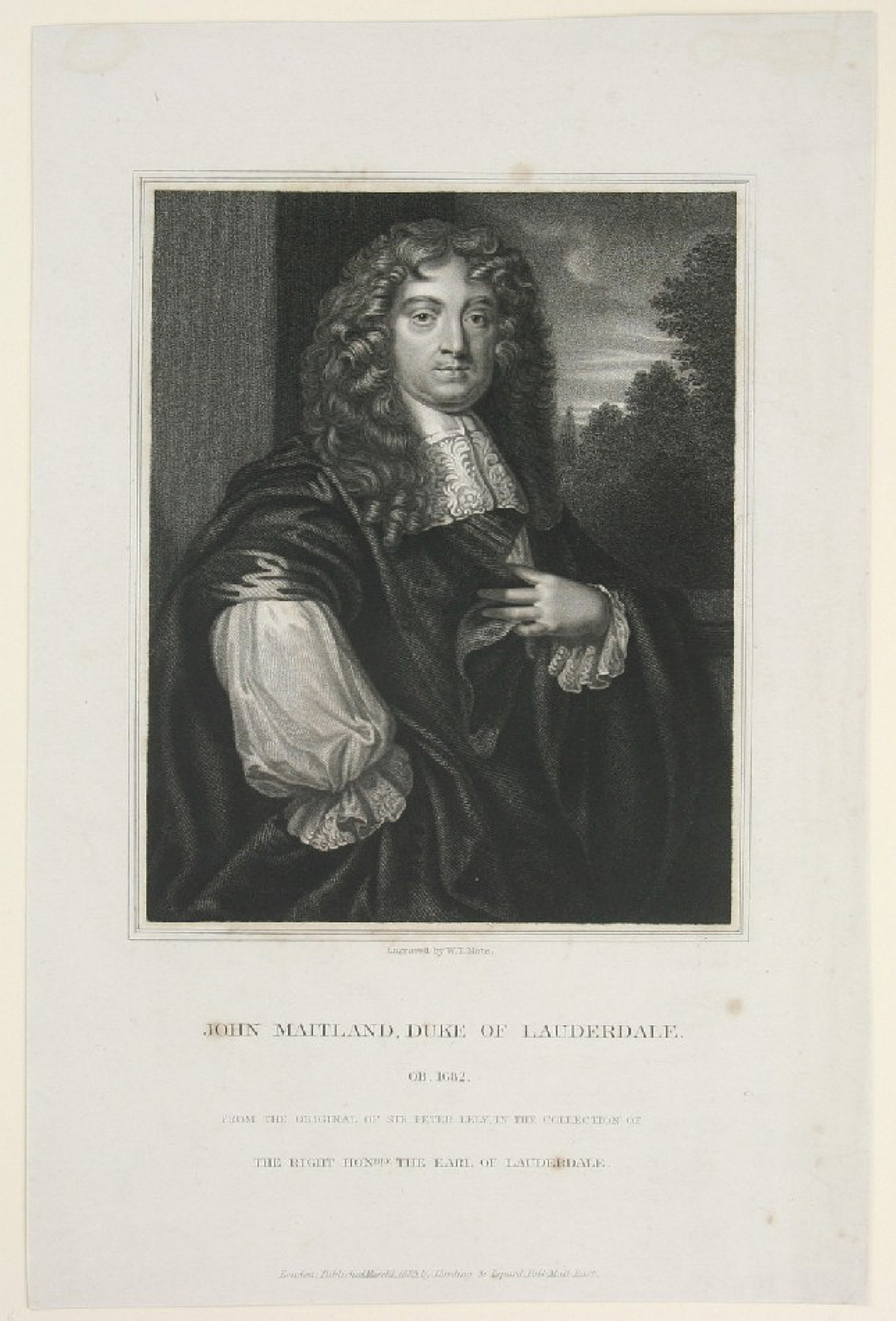 - Description: Steel engraving by W. T. Mote, inscribed: “Engraved by W. T. Mote John Maitland, Duke of Lauderdale. Ob. 1682. From the Original of Sir Peter Lely in the Collection of the right Hon. ble the Earl of Lauderdale London, Published Mach 1835 by Harding & Lepard Pall. Mall East.” Very impressive portrait of John Maitland as a half figure. Gathering his noble cloak with his left hand, his right resting at his side, he looks at the viewer. The long hair, the fine robe and the detail of a window in the background illustrate the dignity and rank of the sitter. The Scotsman John Maitland was a nobleman and politician, he inherited the title Earl of Lauderdale from his father, later he himself was elevated to Duke of Lauderdale.