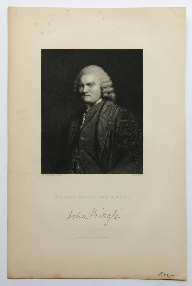 - Beschreibung: Nach einer Vorlage von Joshua Reynolds (1723 Plympton – 1792 London). Brustbild im Halbprofil. Setzte sich als Feldarzt für die verbesserte Organisation der Lazarette und Heilung der Verwundeten ein. Wurde später Leibarzt des Herzogs von Cumberland und verfasste medizinische Schriften. Pringle gilt als Urvater der modernen Militärmedizin.