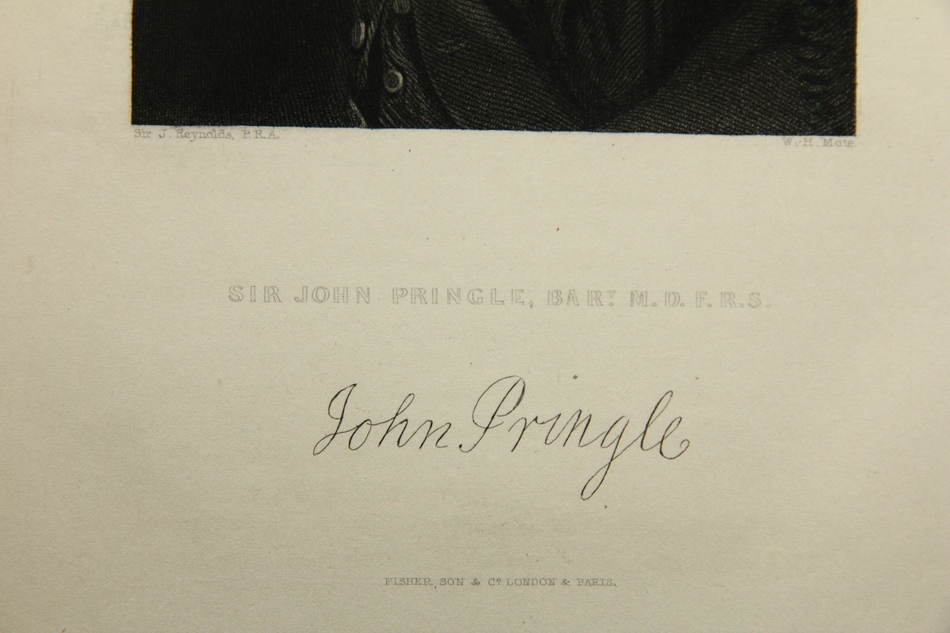 William Henry Mote (1803 – 1871 ) nach Joshua Reynolds (1723 Plymouth – 1792 London), Porträt des brit. Arztes Sir John Pringle (*1707), 19. Jahrhundert, Radierung