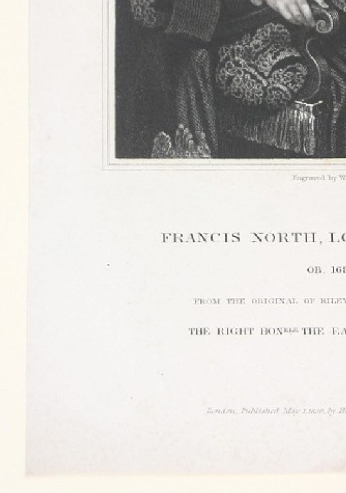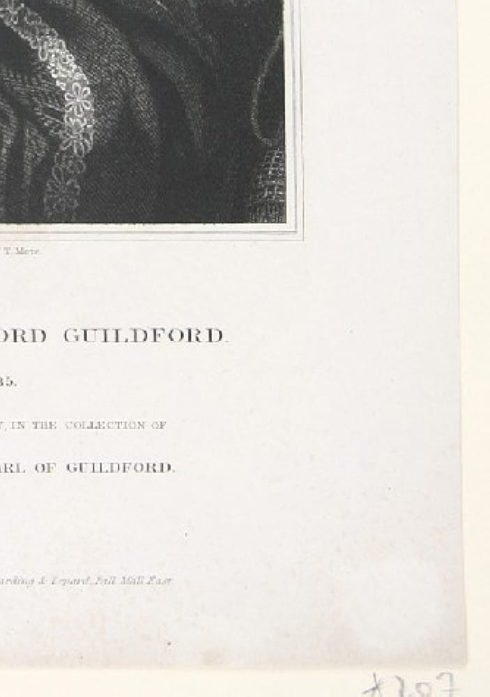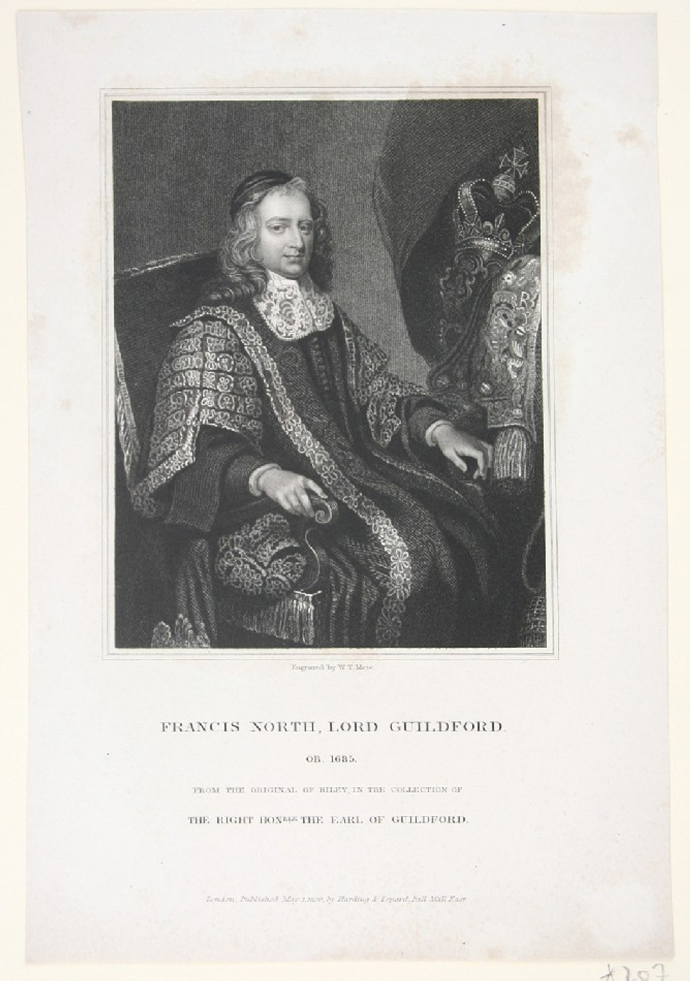 - Description: W. T. Mote, Francis North, Lord Guildford, steel engraving after a painting by John Riley, 1830. Description: Steel engraving by W. T. Mote, inscribed at the bottom: “Engraved by W. T: Mote Francis North, Lord Guildford OB 1685 From the original of Riley, in the Collection of the right hon. ble Earl of Guildford London, Published May 1, 1830, by Harding & Lepard, Pall Mall East”. Very nice portrait of Lord Guilford. The sheet visualises the position and importance of the sitter Lord Guilford is sitting on a throne, a crown is laid down in front of a curtain at the left side of the picture. Francis North, 2nd Earl of Guilford (London 1732 – ibid. 1792) was British Prime Minister.