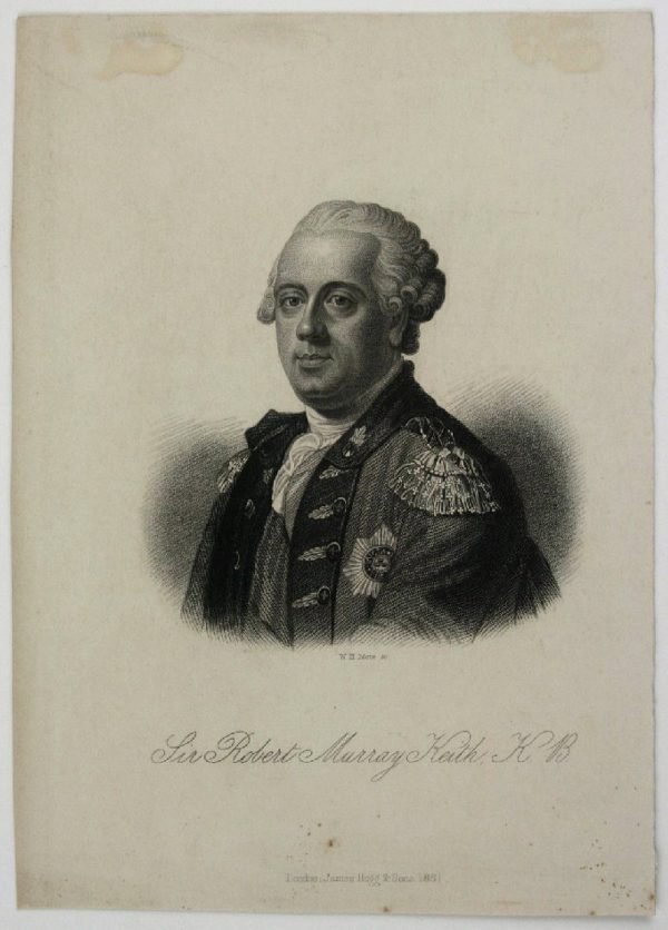 - Beschreibung: W. H. Mote, Sir Robert Murray Keith, Stahlstich, 1861. Beschreibung:Stahlstich von W. H. Mote, bezeichnet: “W. H. Mote sc. Sir Robert Murray Keith, K. B. London: James Hogg&Sons, 1861”. Porträt von Sir Robert Murray Keith als Brustbild nach links. Zu weißer Perücke trägt er eine Jacke mit Orden. Sir Robert Murray Keith (1730 – 1795) war englischer Diplomat, u. a. Gesandter am sächsischen Hof. W. H. Mote war britischer Stahlstecher, erste Erwähnung um 1850, letzte Erwähnung um 1907.