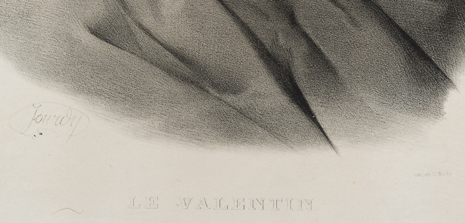 - Bezeichnung: Unten links in der Darstellung ist die Künstlersignatur zu sehen: “Jourdy”. Unten rechts bezeichnet: “lith. de C. Motte”.