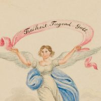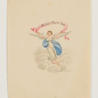 - Beschreibung: Engel mit Banderole über den Kopf haltend: “Freiheit Tugend Gott”. Die Karte stammt aus einer Sammlung Glückwunschkarten der Biedermeier Zeit.