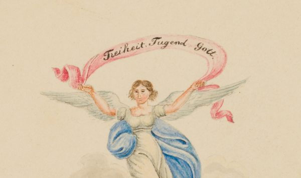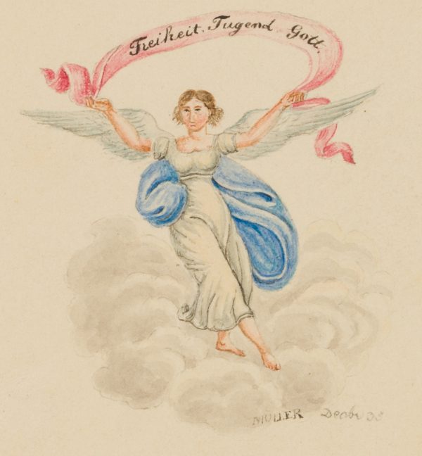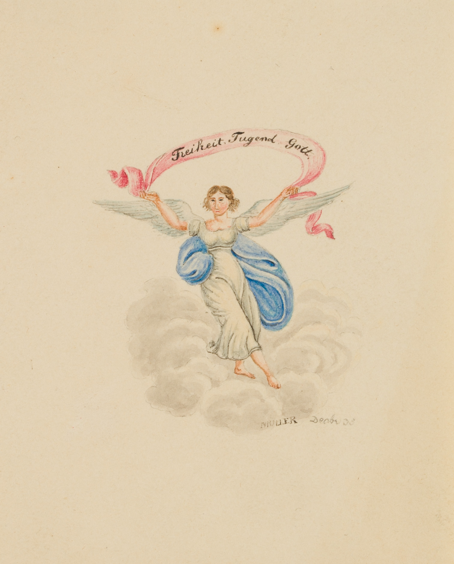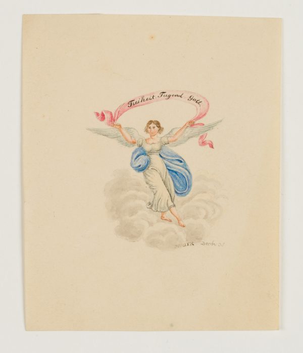 Müller (19. Jahrhundert), Glückwunschkarte mit Engel. Freiheit, Tugend, Gott, 1835, Aquarell
