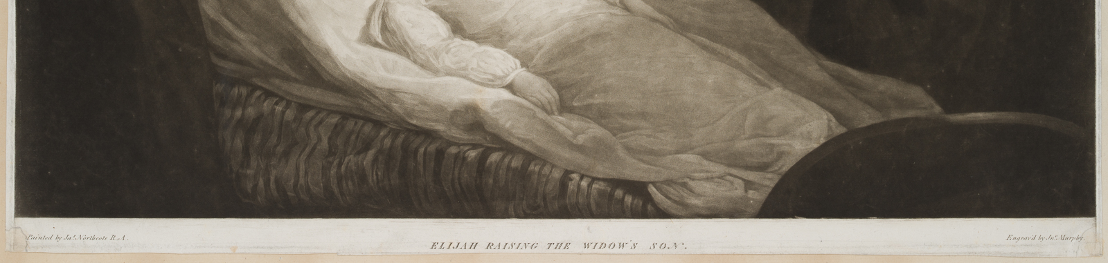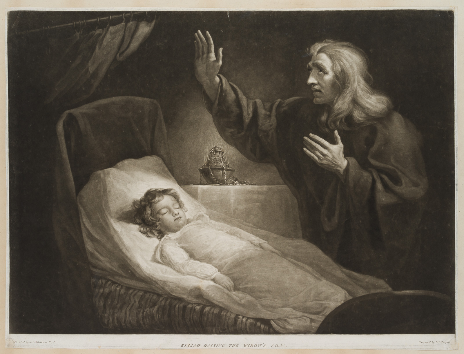 - Description: Elijah holds his right hand over the widow’s infant son, who is lying on a wicker bed wrapped in a white shroud; on the table beside him is an incense burner which brings the child to life. Signed below the depiction “Painted by Ja. Northcote R.A. / Elijah raising the widow’s son. / Engrav’d by Jn. Murphy.”