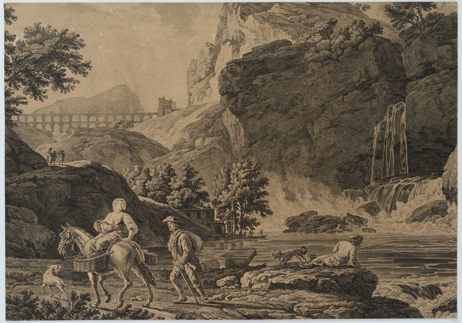 Nicolaes Berchem (1620 Haarlem – 1683 Amsterdam) zugeschrieben, Ländliche Szene. Felsige Flusslandschaft mit reisendem Paar, Angler am Ufer und weiteren Staffagefiguren, , Radierung
