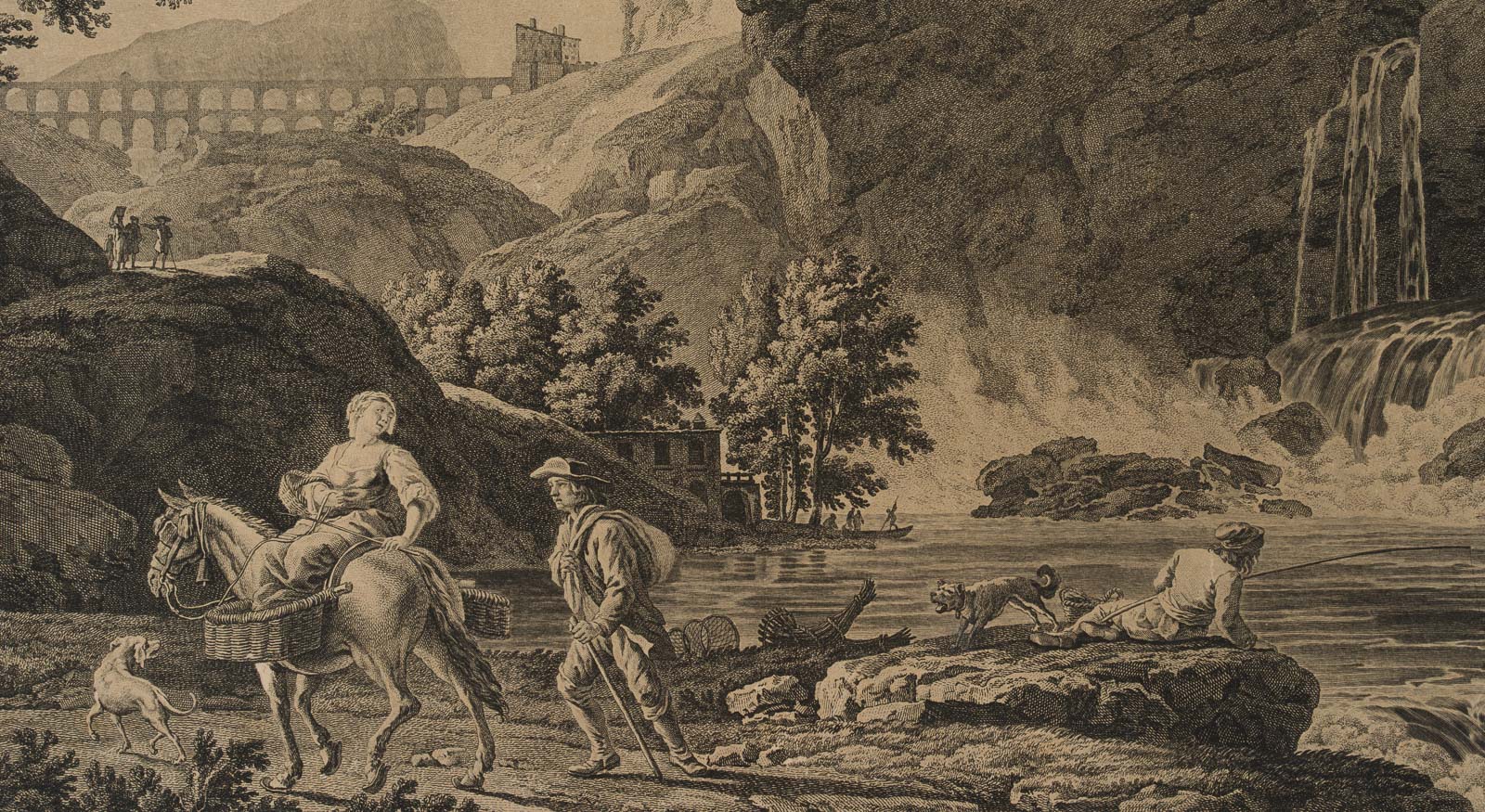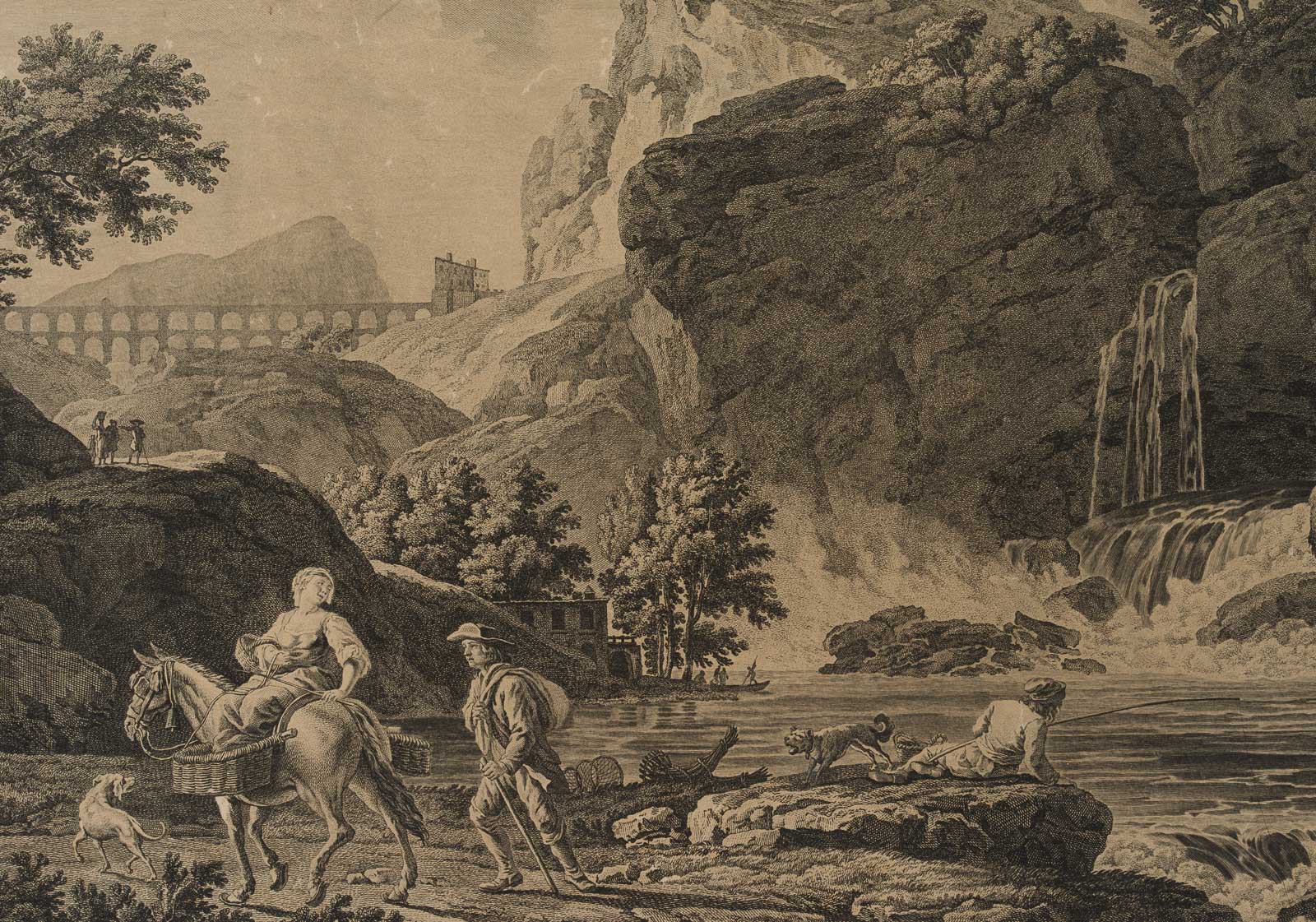 Nicolaes Berchem (1620 Haarlem – 1683 Amsterdam) attributed, Rural scene. Rocky river landscape with travelling couple, angler on the bank and other staffage figures., , Etching