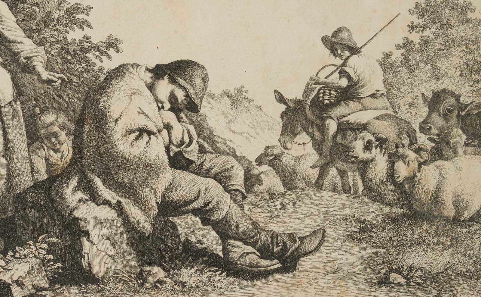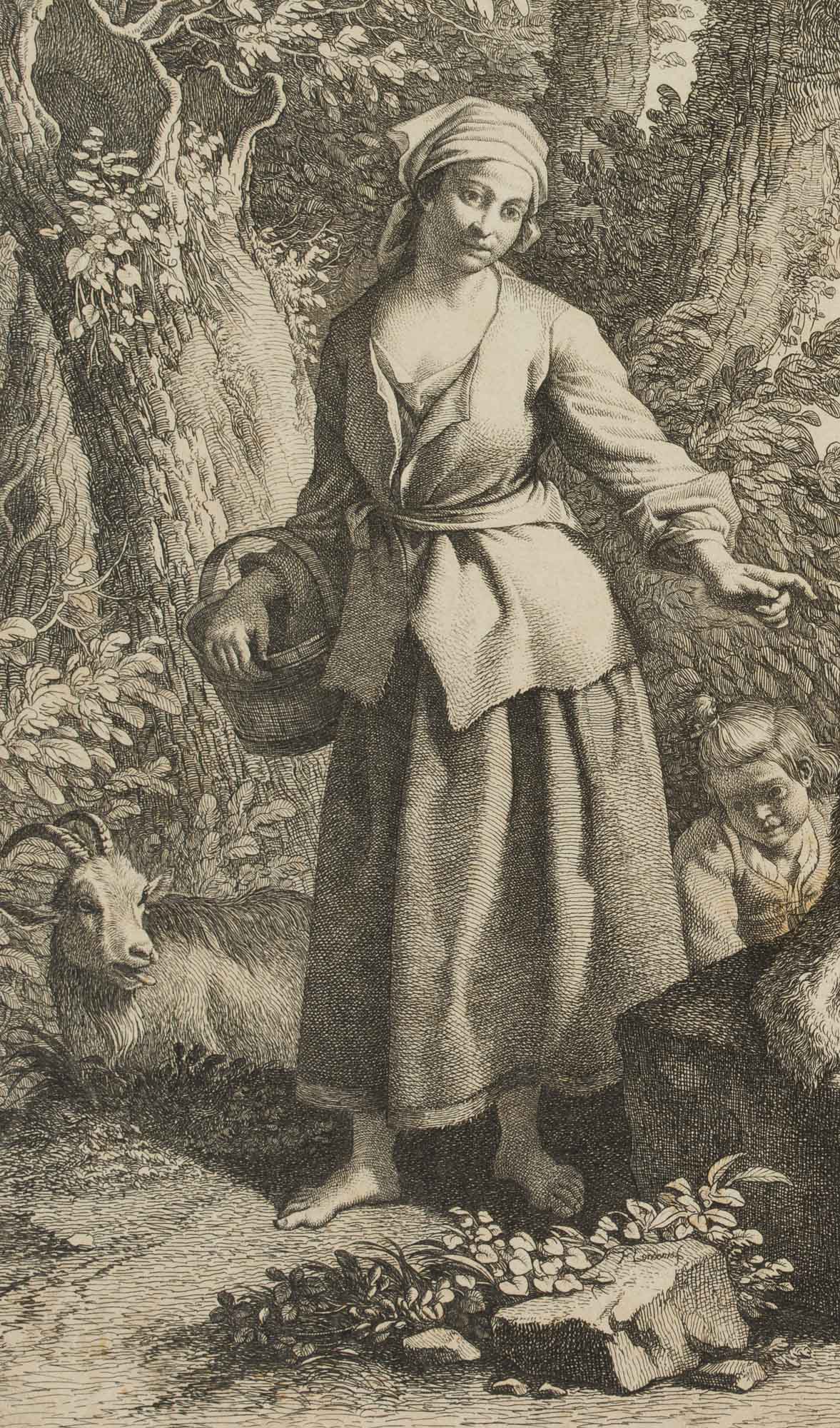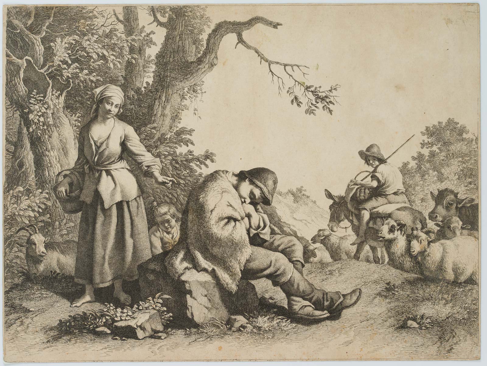 Nicolaes Berchem (1620 Haarlem – 1683 Amsterdam) attributed, Sleeping shepherd curiously eyed by a farmer’s wife with child and a shepherd on a donkey with cow and flock of sheep, , Etching