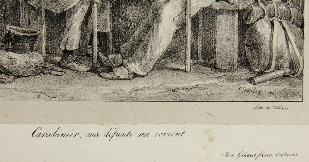 - Beschreibung: Aus Charlets Album lithographique von um 1826. Lithographie von “Villain”. Innerhalb der Darstellung im Stein signiert.