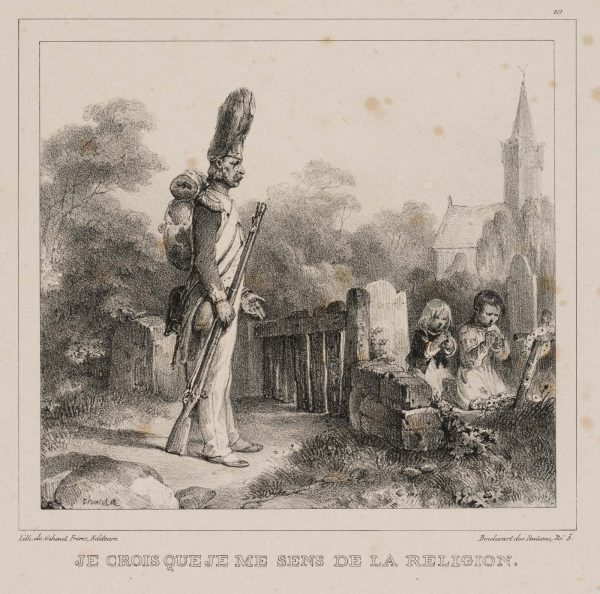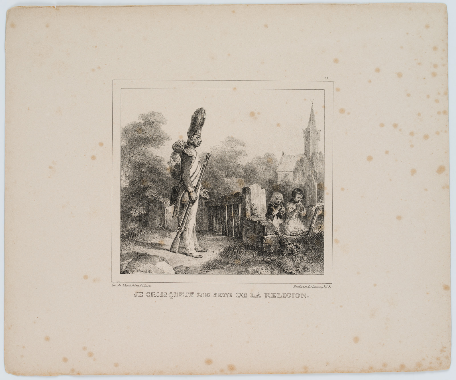 Nicolas-Toussaint Charlet (1792 Paris – 1845 ebd.), Grenadier vor einem Friedhof, “Je crois que je me sens de la religion.”, Aus der Reihe: “Vie Civile Politique et Militaire du Caporal Valentin. 1ère partie”, No. 10, Verleger: Gihaut Frères, Paris, 1837, Lithographie