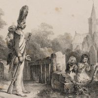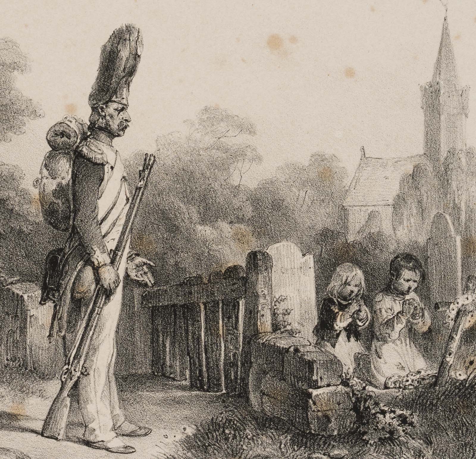 Nicolas-Toussaint Charlet (1792 Paris – 1845 ibid.), Grenadier vor einem Friedhof, “I think I feel religious”, Aus der Reihe: “Vie Civile Politique et Militaire du Caporal Valentin 1st part”, No 10, Verleger: Gihaut Frères, Paris, 1837, Lithography