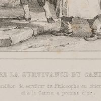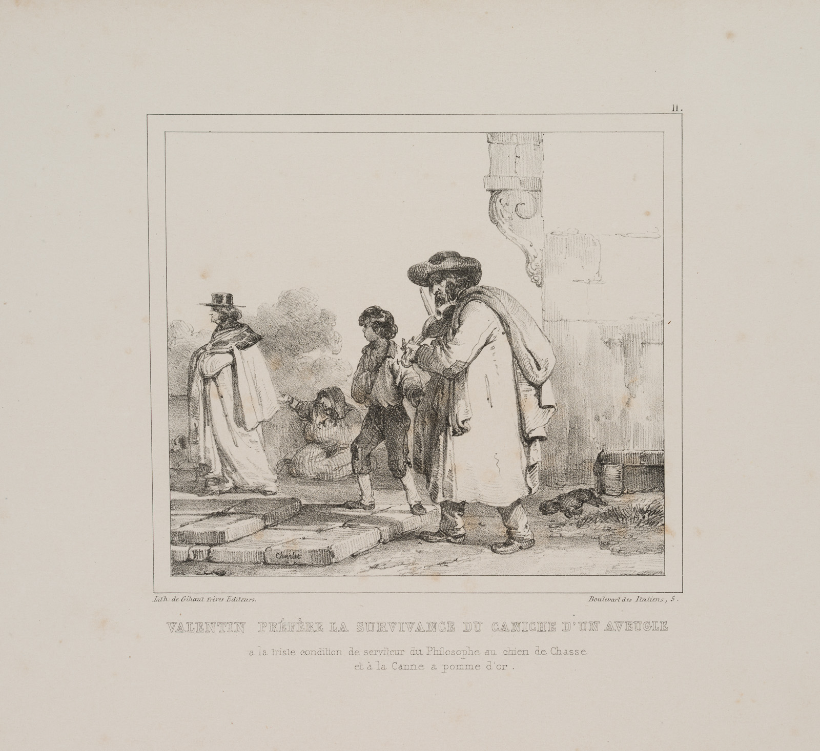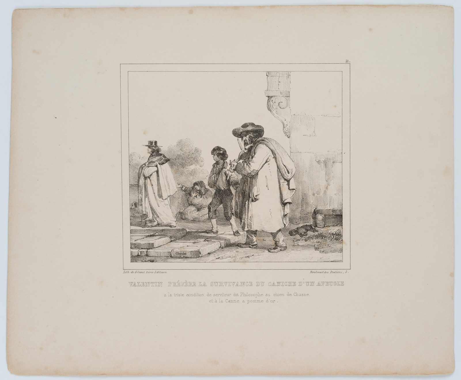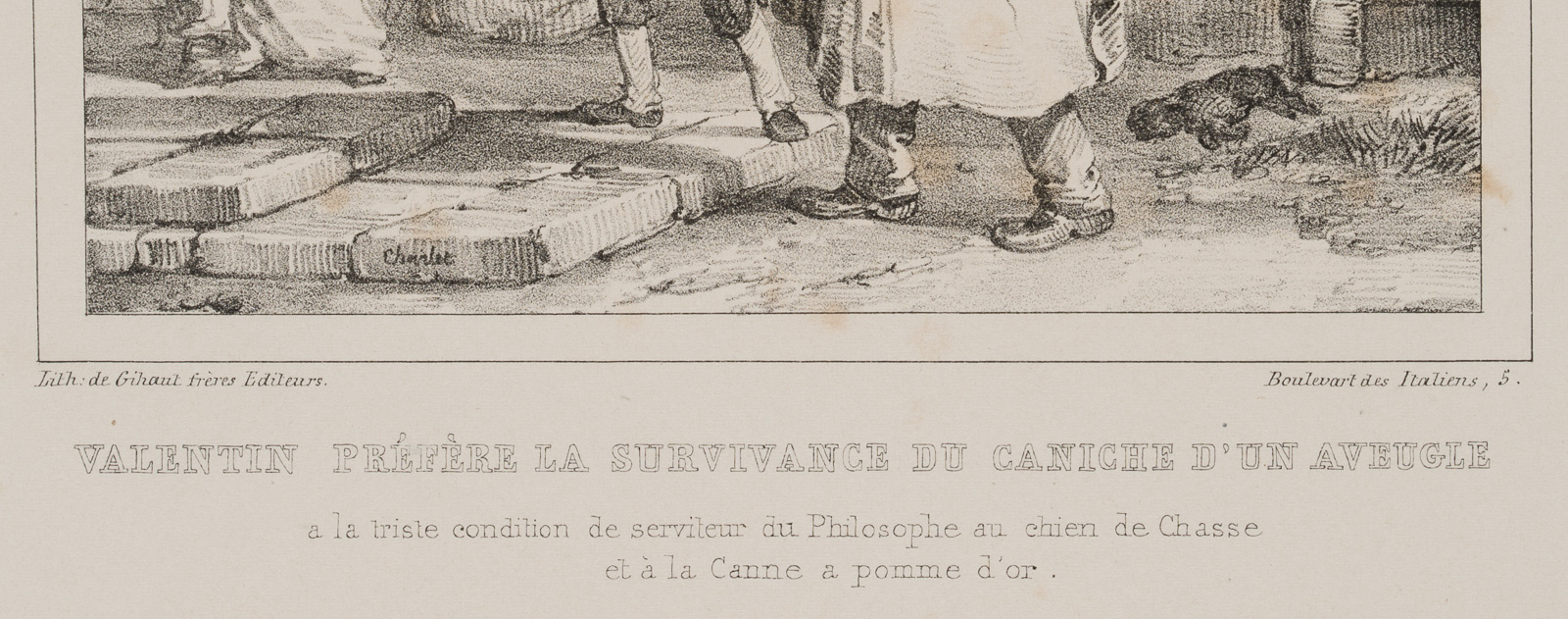- Description: The artist’s signature “Charlet” can be found in the lower left corner of the image. Inscribed below the depiction “Lith. De Gihaut frères Editeurs / Boulevart des Italiens, 5.” underneath titled “Valentin préfère la survivance du caniche d’un aveugle / a la triste condition de serviteur du Philosophe…”. Plate 11 of the album (numbered at the top right).