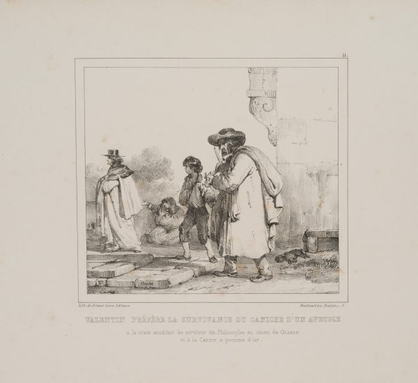 - Beschreibung: In der Darstellung unten links findet sich die Signatur des Künstlers: “Charlet”. Unter der Darstellung bezeichnet “Lith. De Gihaut frères Editeurs / Boulevart des Italiens, 5.” darunter betitelt “Valentin préfère la survivance du caniche d’un aveugle / a la triste condition de serviteur du Philosophe..”. Platte 11 des Albums (oben rechts nummeriert).