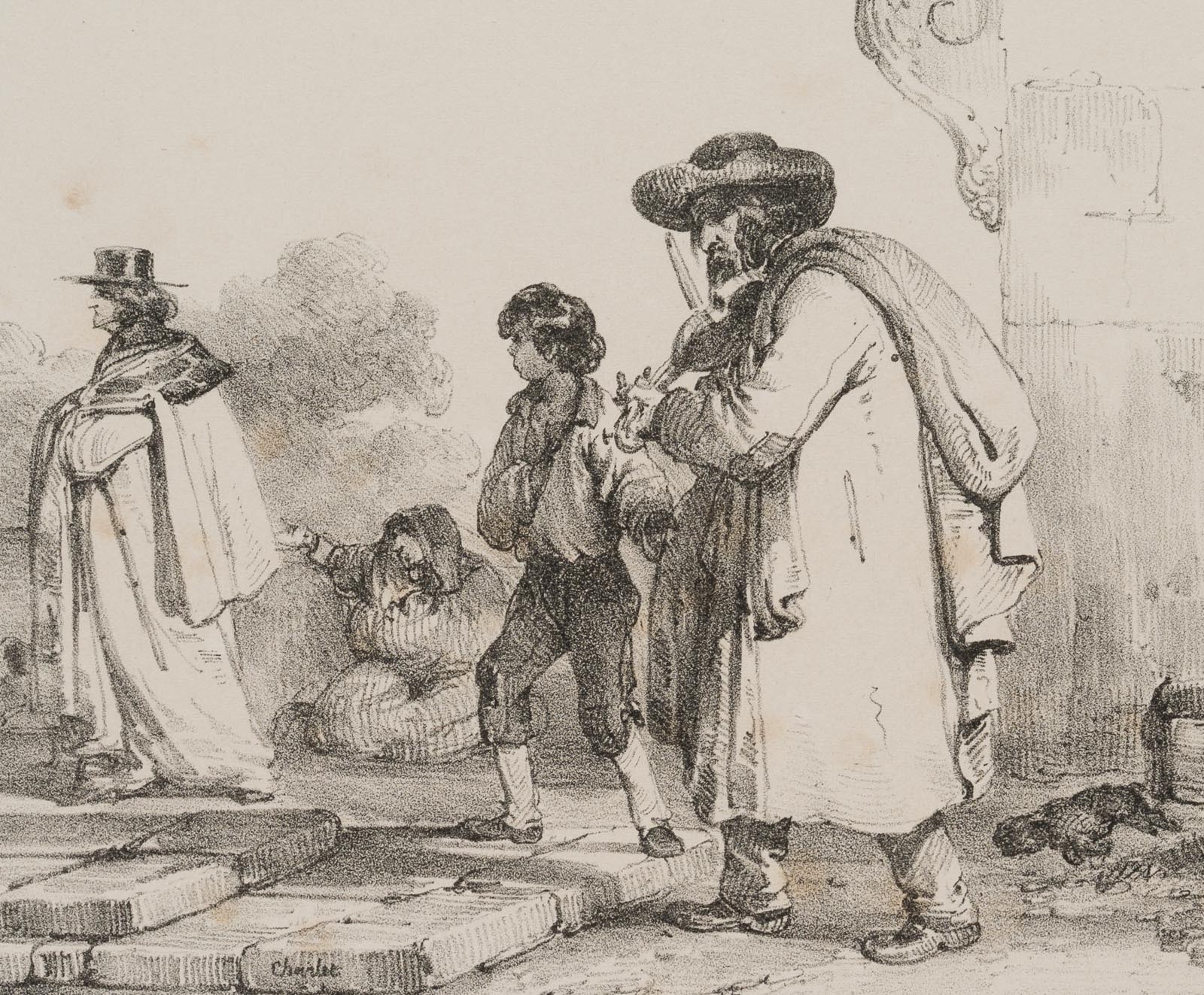 Nicolas-Toussaint Charlet (1792 Paris – 1845 ibid.), “Valentin prefers the survival of a blind man’s poodle”, 1837, Lithography