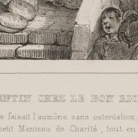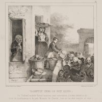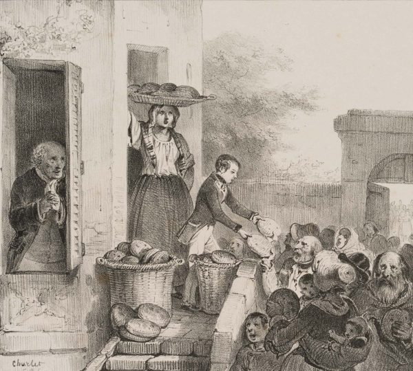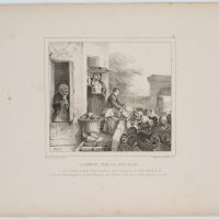 Nicolas-Toussaint Charlet (1792 Paris – 1845 ebd.), “Valentin chez le bon riche”, Verteilung von Almose an die Armen, Aus der Reihe: “Vie Civile Politique et Militaire du Caporal Valentin. 1ère partie”, No. 9., Verleger: Gihaut Frères, Paris, 1837, Lithographie