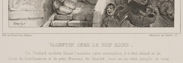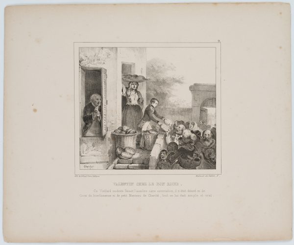 Nicolas-Toussaint Charlet (1792 Paris – 1845 ibid.), “Valentin chez le bon riche”, Verteilung von Almose an die Armen, Aus der Reihe: “Vie Civile Politique et Militaire du Caporal Valentin 1st part”, No 9, Verleger: Gihaut Frères, Paris, 1837, Lithography