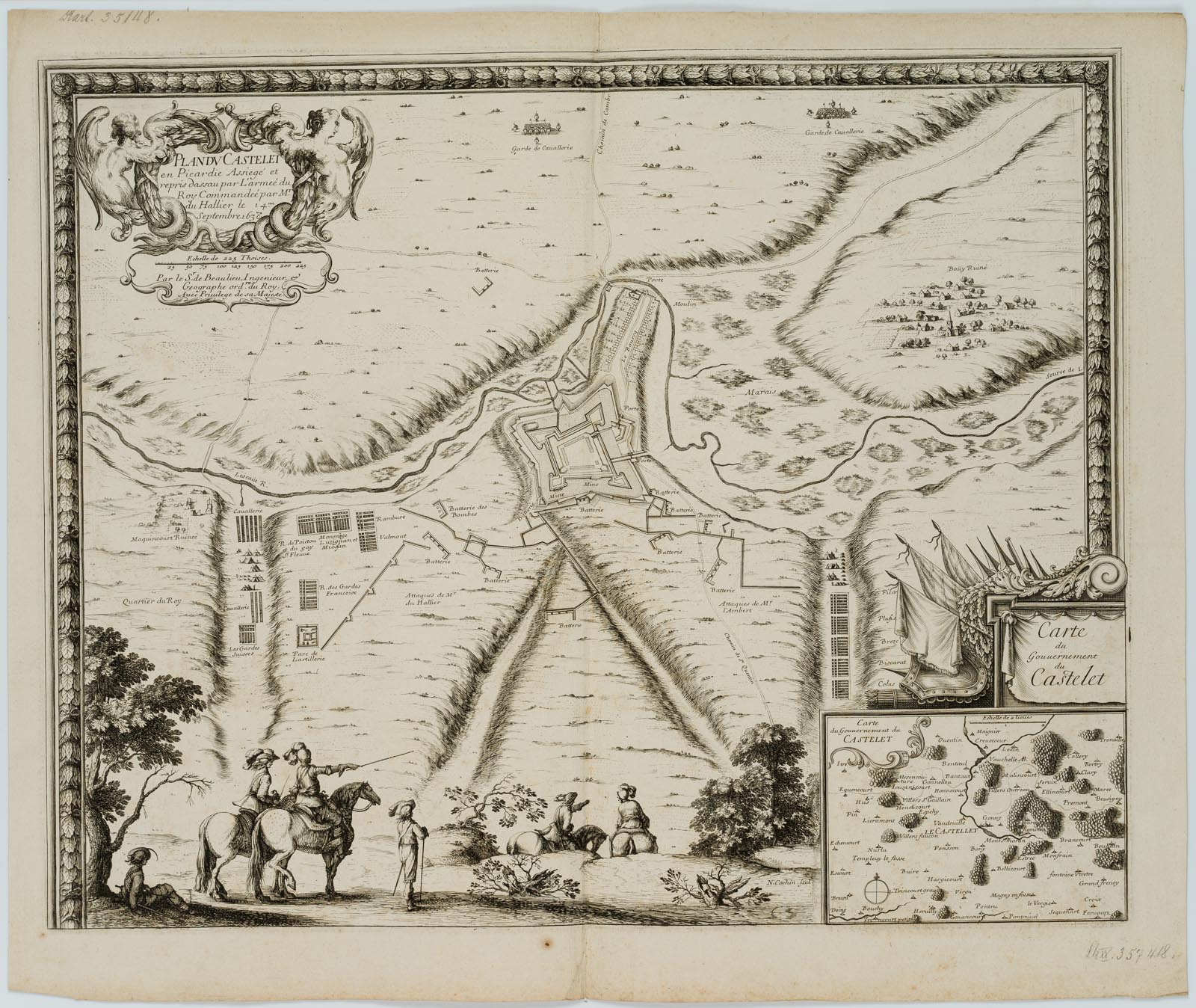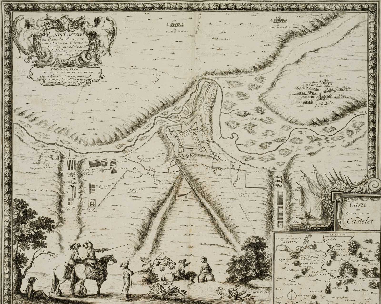 - Description: Inscribed in the upper left cartouche “PLAN DV CASTELET en Picardie Assiegé et repris dassau par L’armée du Roy Commandée par Mr. du Hallier le 14.me Septembre 1638 Par le Sr. de Beaulieu Ingenieur [et] Geographe ord.re du Roy. Auec priuilege de Sa Majesté.” The map is vividly illustrated and labelled. In the foreground a group of soldiers are riding past. They are surveying the landscape and the map respectively and seem to be discussing the following military moves.