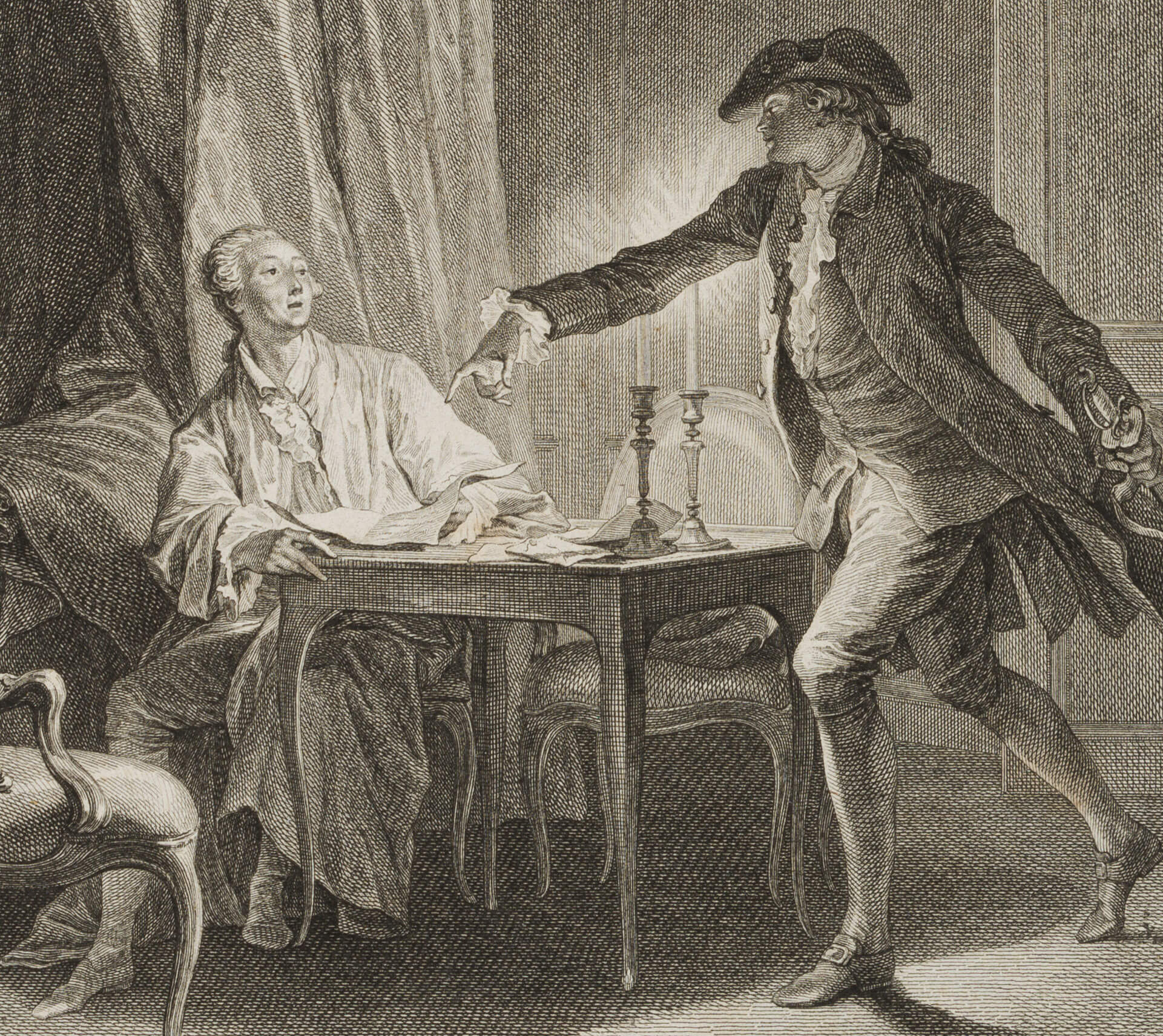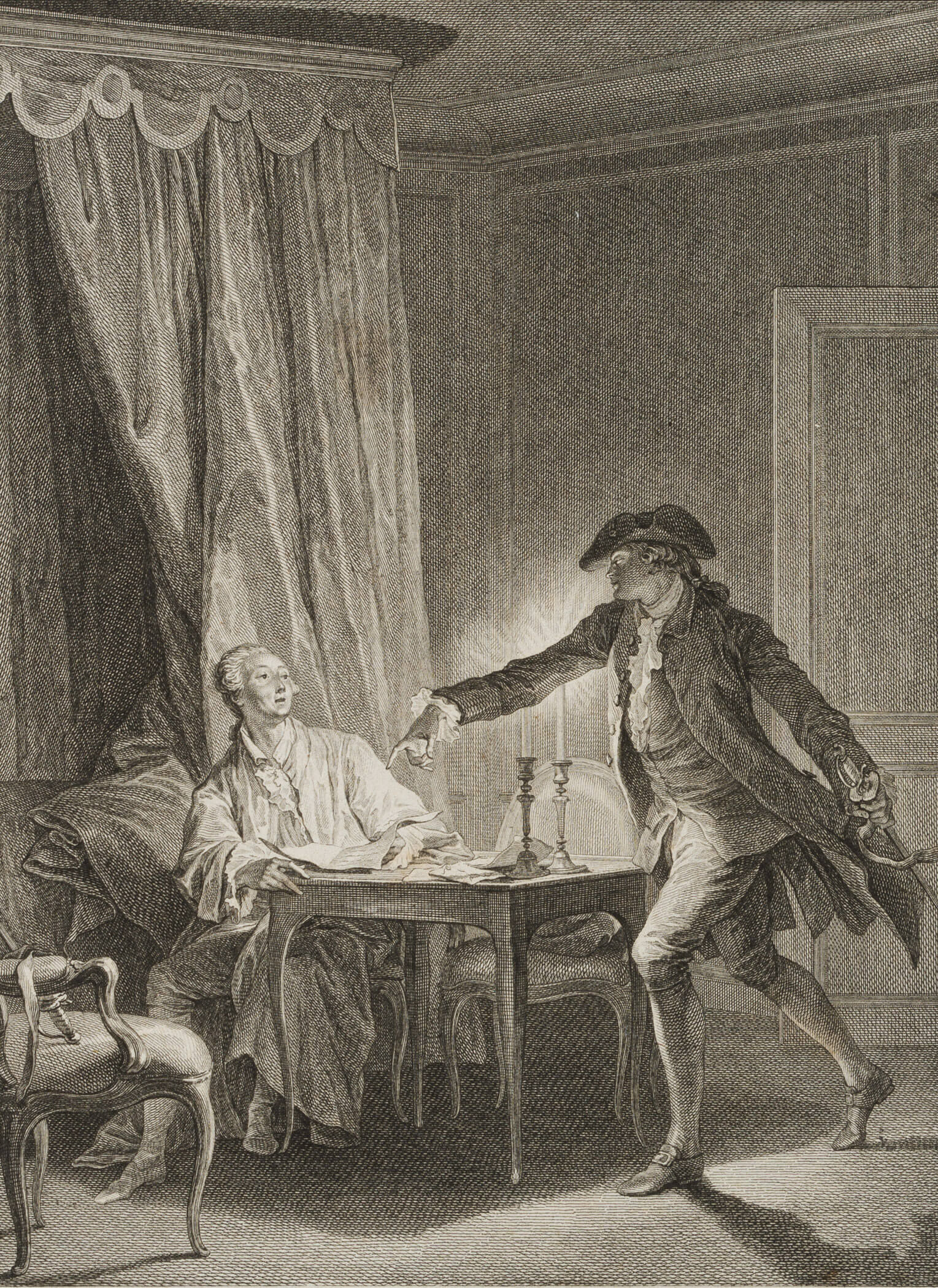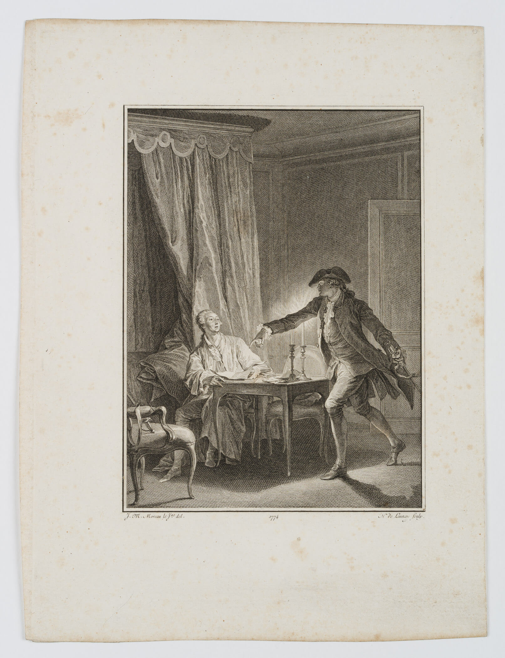 - Schlagworte: Literarische Illustration, Nacht, Duell, Herausforderung, Interieur, Kerzenlicht, Überfall, Mode, Literatur, Frankreich, Rokoko, 1750-1799