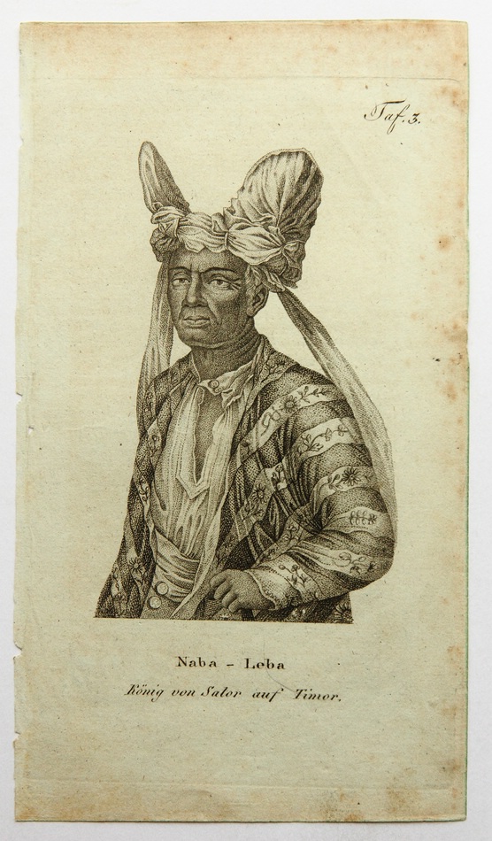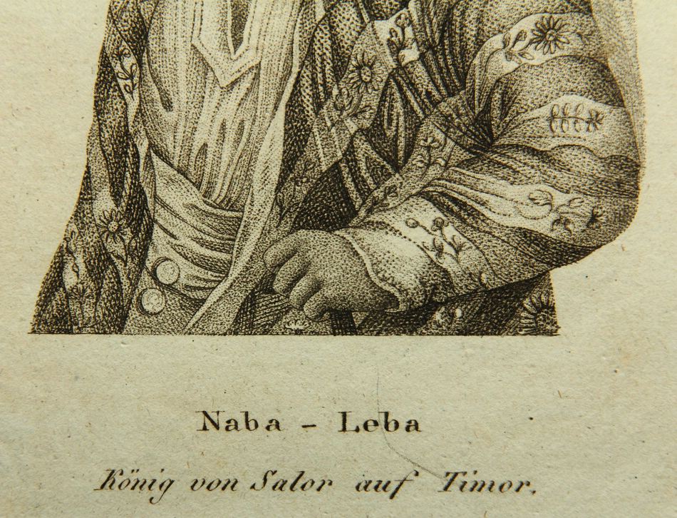 • Description: Half-portrait in half-profile of the south-east Indonesian King Naba-Leba in the traditional court costume. The depiction probably originates from a historical ethnological work after an expedition to Indonesia in the 19th century.