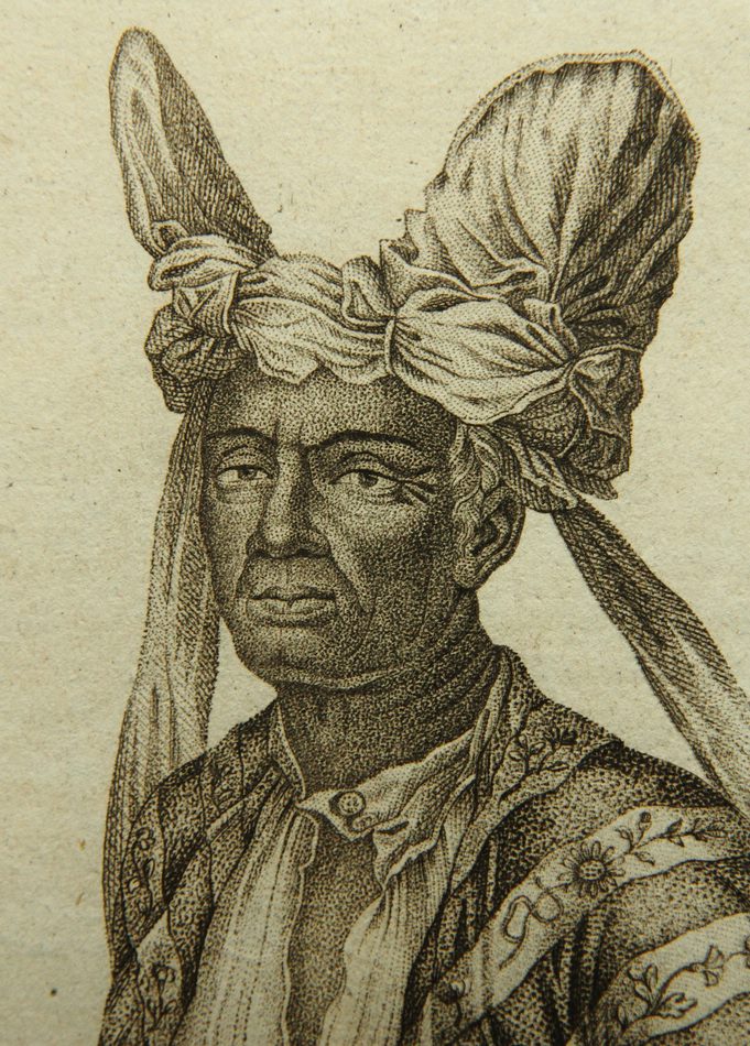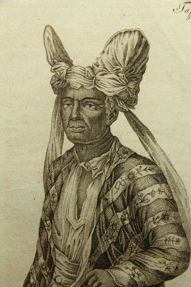 • Beschreibung: Halbporträt in Halbprofil des südostindonesischen Königs Naba-Leba in der traditionellen Hoftracht. Die Darstellung stammt vermutlich aus einem historischen völkerkundlichen Werk nach einer Expedition nach Indonesien im 19. Jahrhundert.