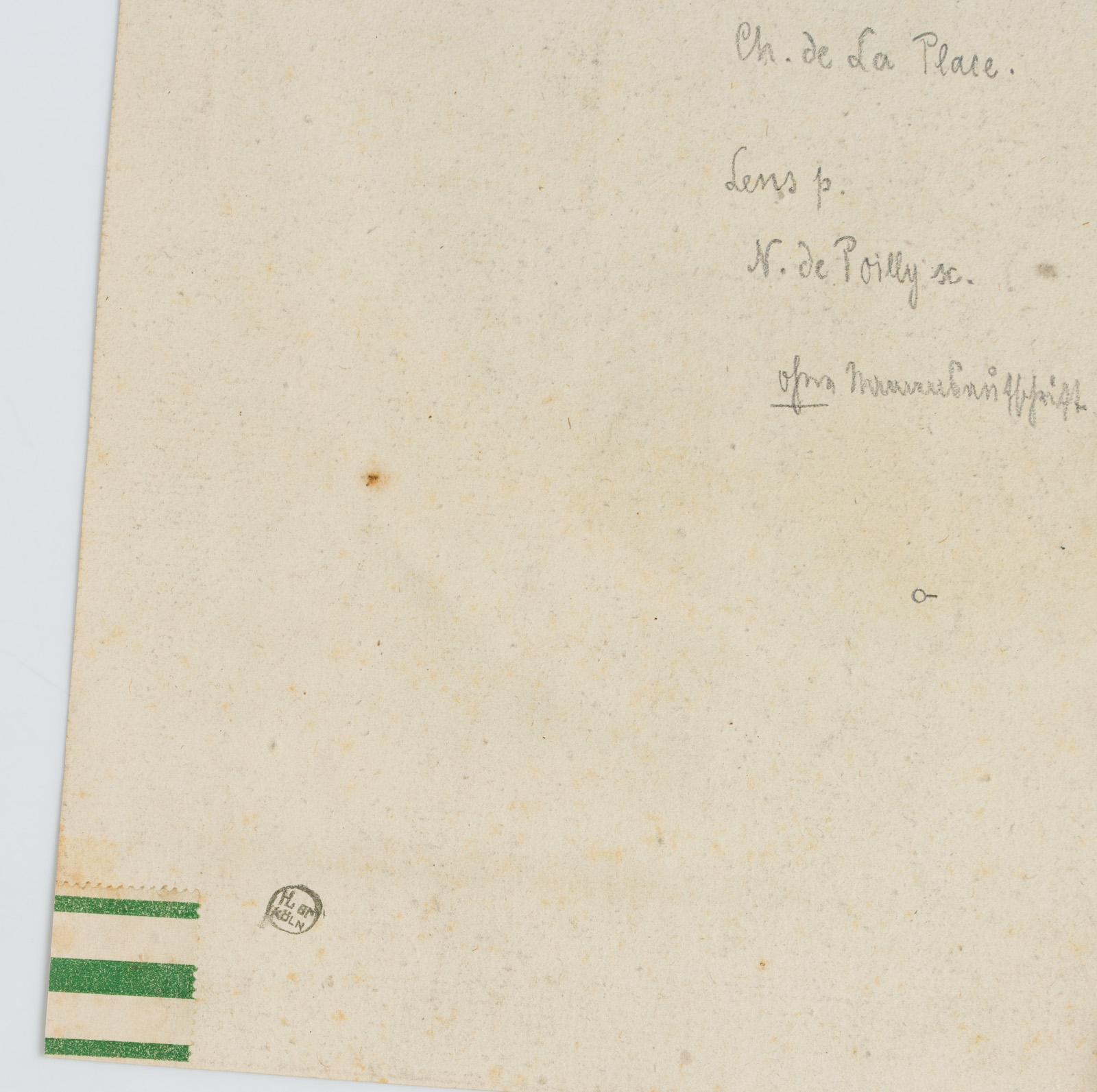 • Description: Without name inscription in an oval frame. Signed below the image “N. Poilly sc. / Lens pinx.”, collector’s stamp on verso “H.Lempertz Sr.”, noted in Lugt L.1337.