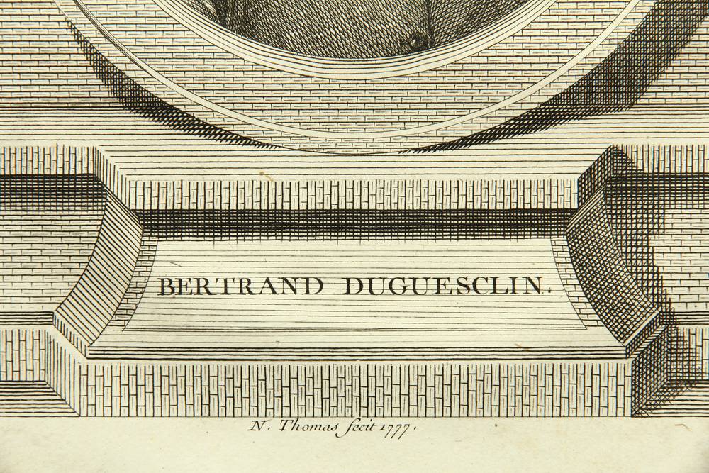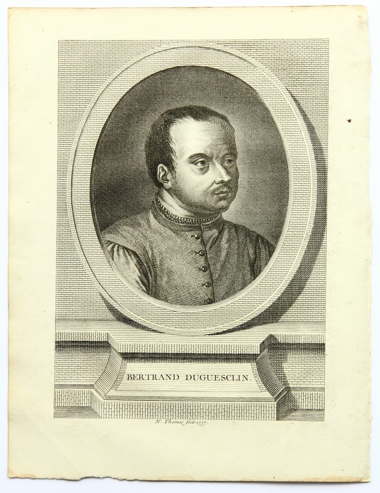 N. Thomas (18th century), Historicising portrait of the French army commander and connétable Betrand du Guesclin (c 1320 near Dinan – 1380 Châteauneuf-de-Randon), military leader in the Hundred Years’ War and national hero of France, knight without fault, 1777, Copper engraving