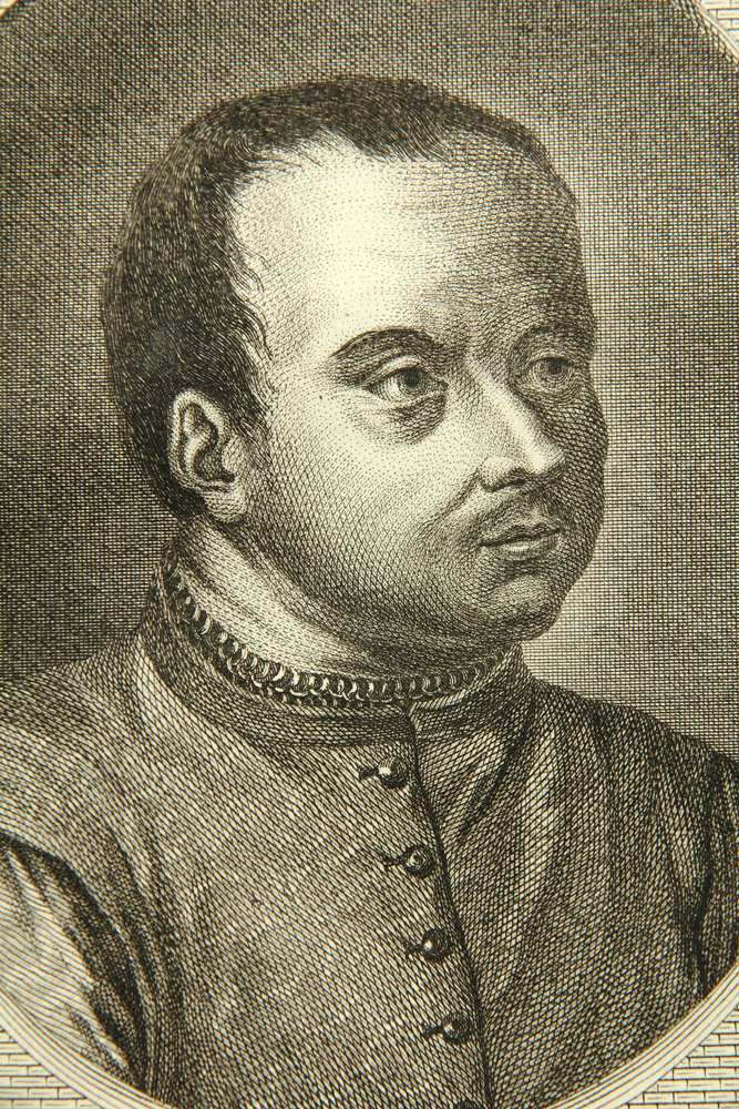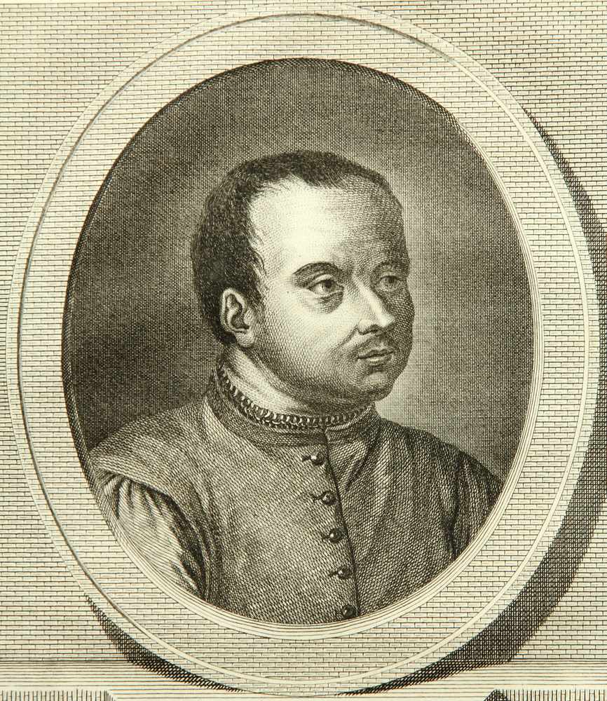 - Bezeichnung: Unterhalb des fingierten ovalen Rahmens befindet sich der Name des Dargestellten. Darunter ist das Blatt in der Druckplatte vom Künstler signiert und auf 1777 datiert. Die Darstellung stammt aus einer umfangreichen Serie berühmter historischer Personen von dem italienischen Künstler Vincenzo Vangelisti (um 1738 Florenz – 1798 Paris).