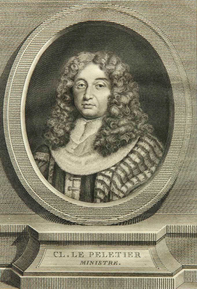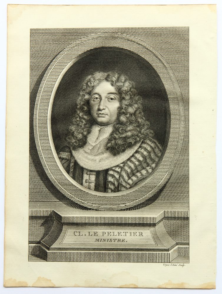Nicolas Joseph Voyez (1742 Abbéville – 1806 Paris), Porträt des französischen Staatsmannes Claude Le Peletier (1631 Paris – 1711 Villeneuve-le-Roi), Vorsteher der Kaufmannsgilde zu Paris und Finanzminister unter König Ludwig XIV., genannt Sonnenkönig, 18. Jahrhundert, Kupferstich