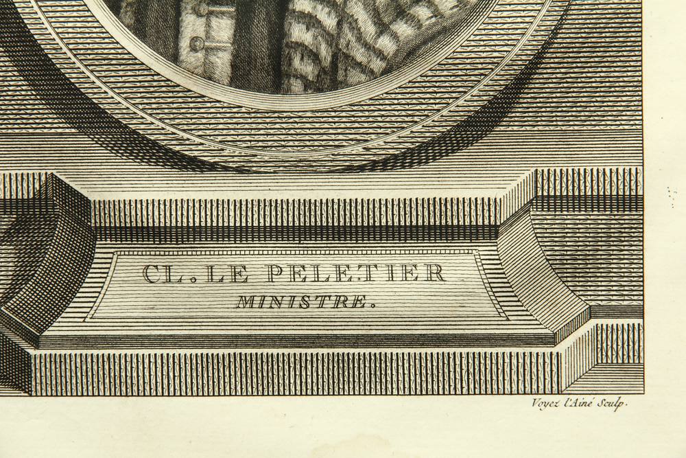 - Bezeichnung: Unterhalb des fingierten ovalen Rahmens befindet sich der Name des Dargestellten mit der Bezeichnung seiner Profession “Ministre”. Darunter ist das Blatt in der Druckplatte vom Künstler signiert. Die Darstellung stammt aus einer umfangreichen Serie berühmter Personen des 17. und 18. Jahrhunderts von dem italienischen Künstler Vincenzo Vangelisti (um 1738 Florenz – 1798 Paris).