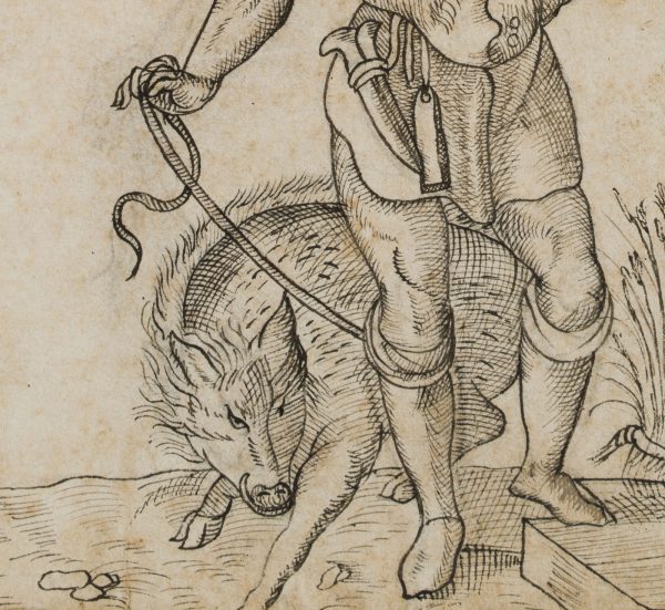 - Bezeichnung: Rechts befindet sich eine weitere Pinselzeichnung des Kopfes. Der Schweizer Zeichner, Kupferätzer und -stecher, Formschneider und Maler kam 1561 nach Nürnberg, um mit Virgil Solis zusammenzuarbeiten. Er schuf Illustrationen zur Bibel, zu Ausgaben antiker und zeitgenössischer Autoren und zu Sachbüchern verschiedenster Bereiche, unter anderem zu religiösen und historischen Themen, zu juristischen Themen wie dem Jagd- und Forstrecht, zum Ackerbau und zur Jagdkunst. Seine Holzschnitte zeichnen sich durch die elegante, etwas manierierte Schlankheit der Figuren aus, wie sie auch die vorliegende Zeichnung präsentiert.