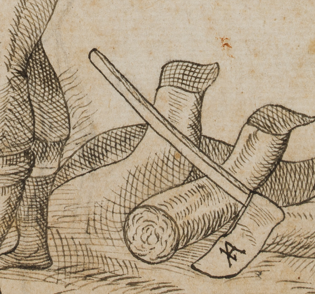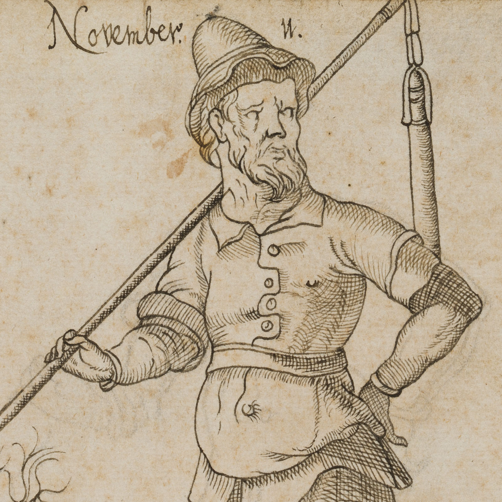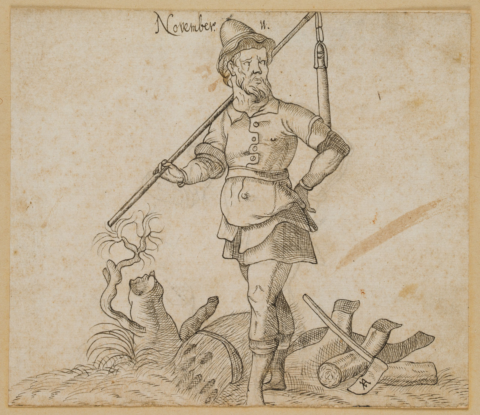 • Inscription: Titled at the top centre of the drawing: “November 11”. On the hatchet with the monogram “JA” lower right. Successful drawing after Jost Amman, which breaks away from the original especially in the expression of the face and thus gains a new quality. The Swiss-born artist came to Nuremberg in 1561 to work together with Virgil Solis. He published numerous books with woodcuts and created illustrations for the Bible, for editions of ancient and contemporary authors and for non-fiction books in a wide variety of fields, including religious and historical subjects, legal topics such as hunting and forestry law, agriculture and the art of hunting. His woodcuts are characterised by the elegant, somewhat mannered slenderness of the figures, as the artist of the present drawing also knows how to reflect.