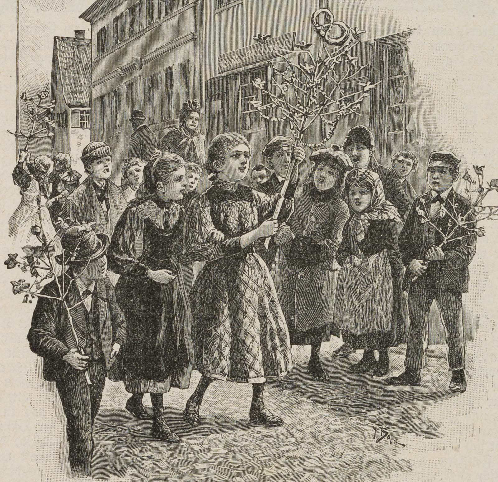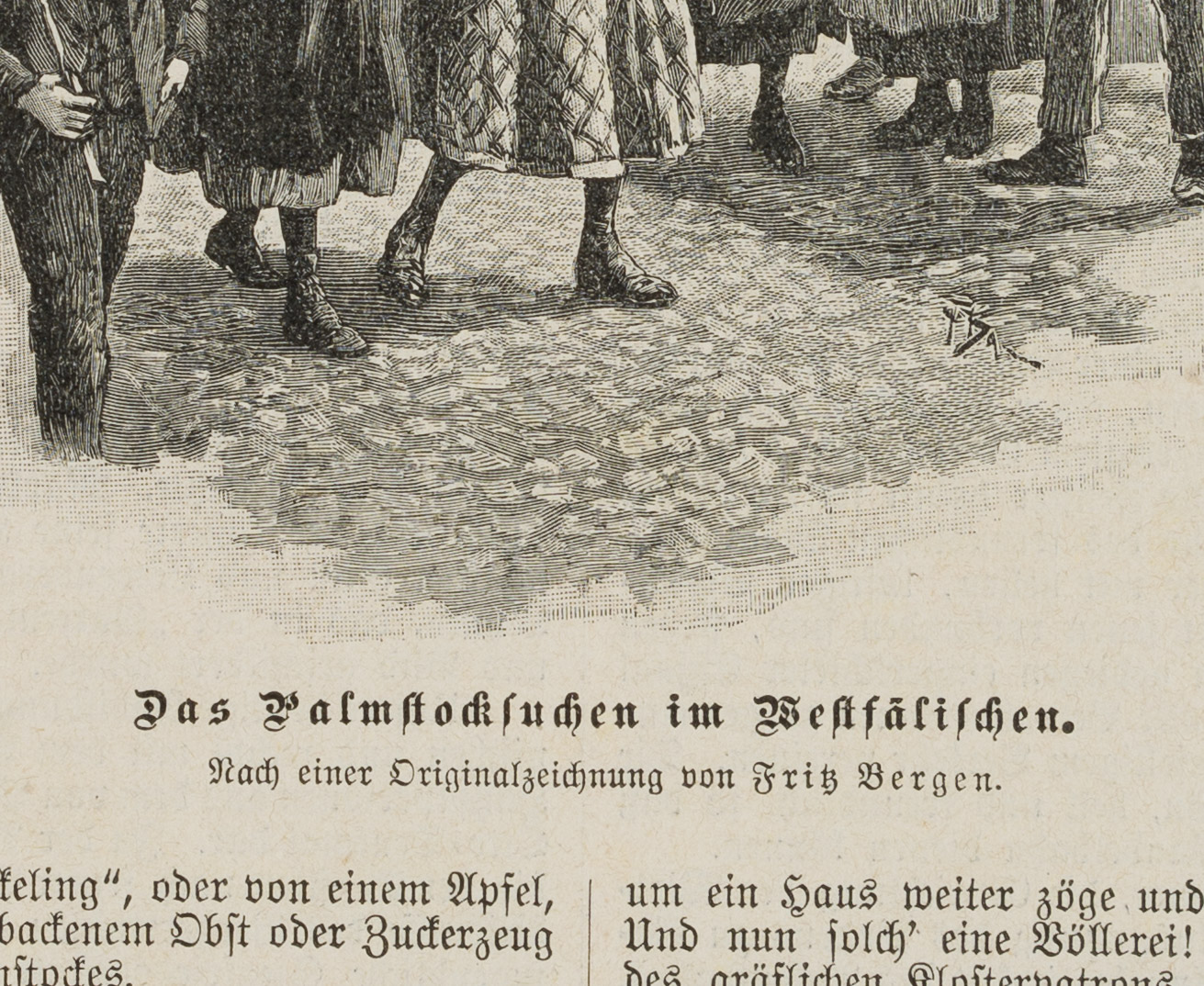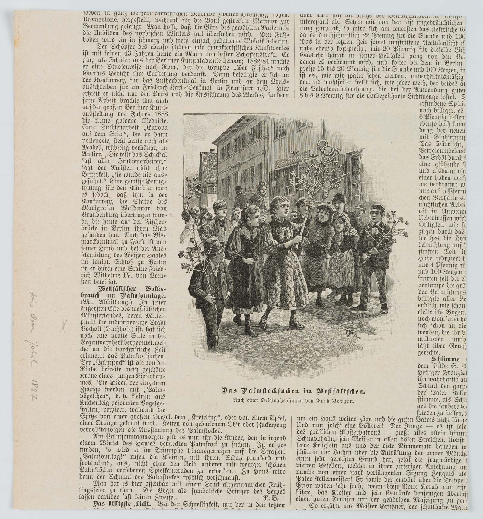 After Fritz Bergen (1857 Dessau – 1941 Munich), The palm stick hunt in Westphalia Spring Festival Westphalian folk custom on Palm Sunday, leaf from ‘die Gartenlaube’, issue 13, 1897, Wood engraving