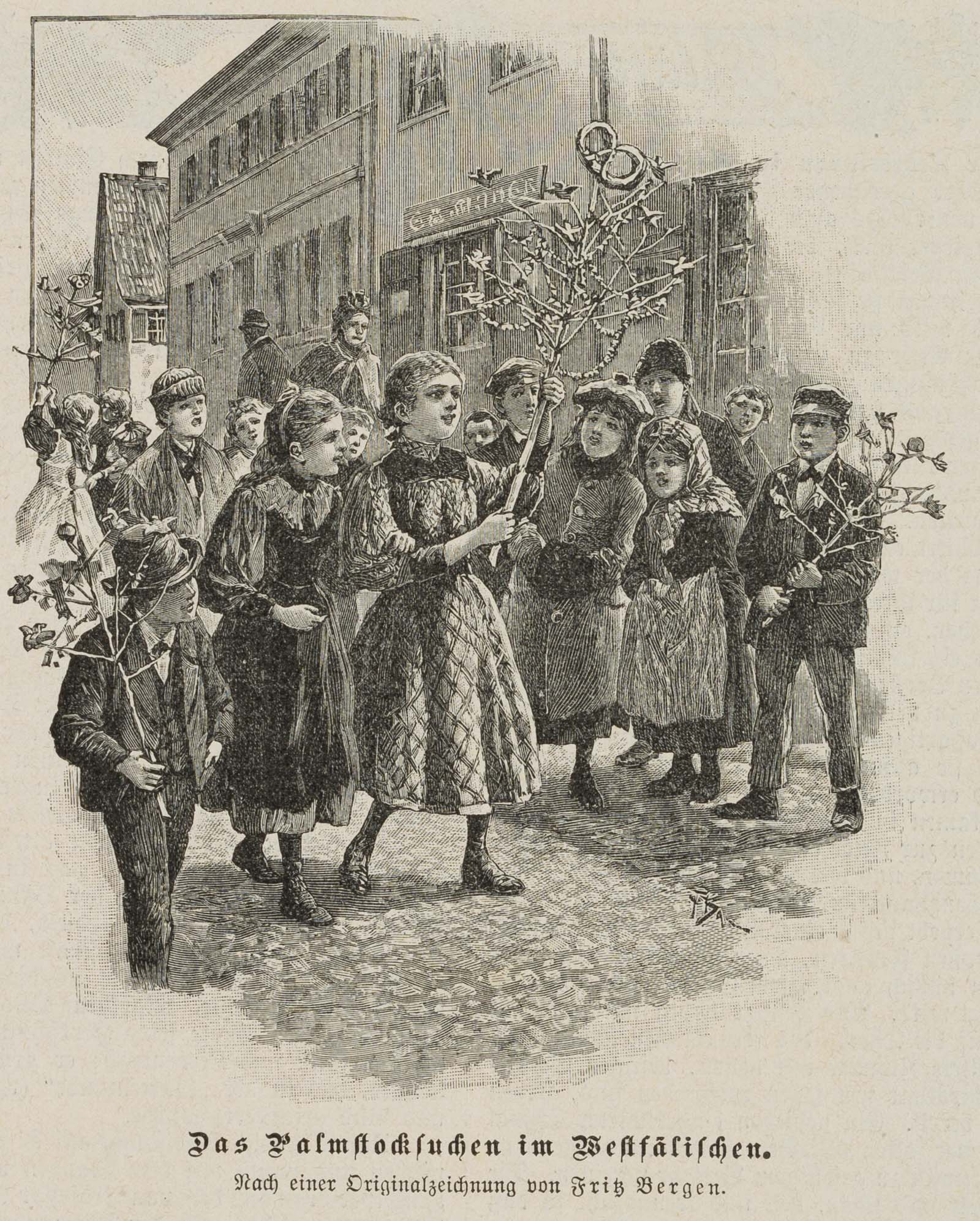 Nach Fritz Bergen (1857 Dessau – 1941 München), Das Palmstocksuchen im Westfälischen. Frühlingsfest. Westfälischer Volksbrauch am Palmsonntag, Blatt aus ‘die Gartenlaube’, Heft 13, 1897, Holzstich