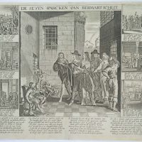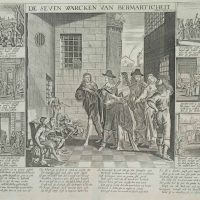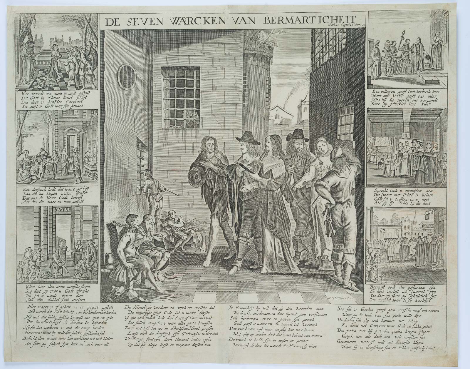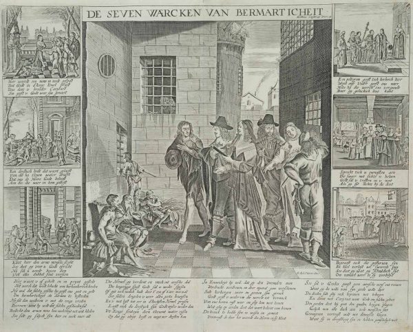- Bezeichnung: Links von oben nach unten: die Hungernden speisen; den Dürstenden zu trinken geben; die Nackten bekleiden und rechts von oben nach unten: die Fremden aufnehmen; die Kranken besuchen; Tote begraben. Mittig und groß: die Gefangenen besuchen. Das Blatt trägt oberhalb den niederländischen Titel: “De seven Waercken van Bermartlichkeit”. Die Darstellungen sind jeweils unterhalb niederländisch beschriftet. Rechts unten in der mittleren Darstellung die Signatur des Herausgebers: “R. & I. Ottens Exc.”.