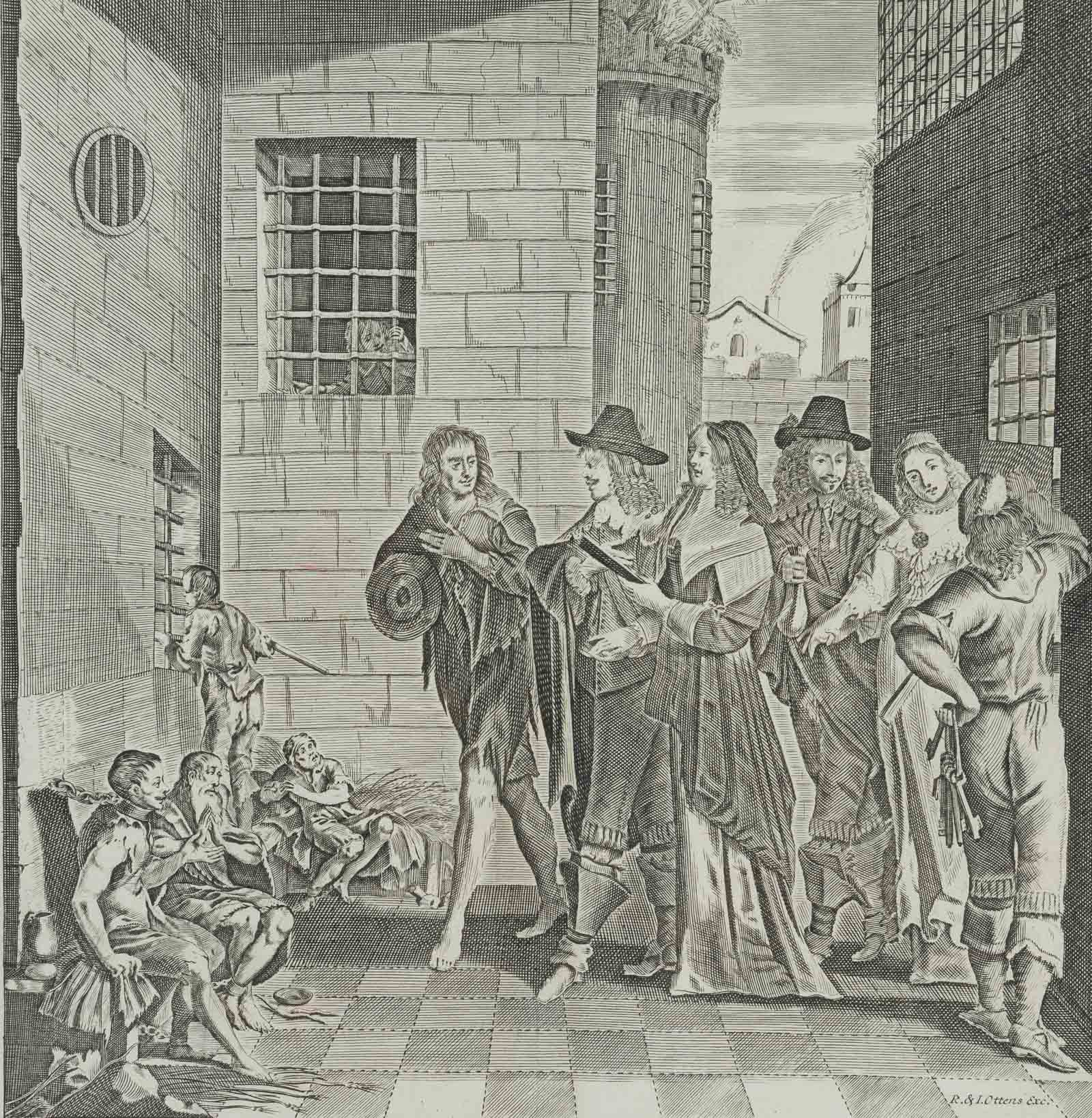 Nach Abraham Bosse (1604 Tours – 1676 Paris), Sieben Werke der Barmherzigkeit. Mit dem Besuch der Gefangenen groß im Mittelpunkt und den sechs weiteren Werken auf die Seiten links und rechts verteilt, 1725, Kupferstich
