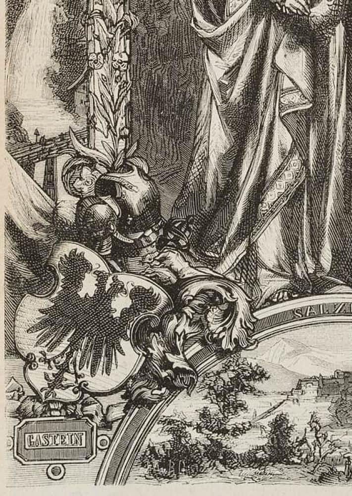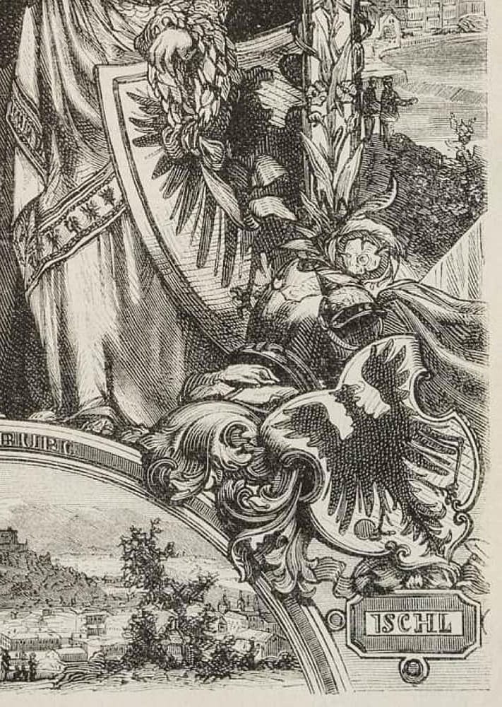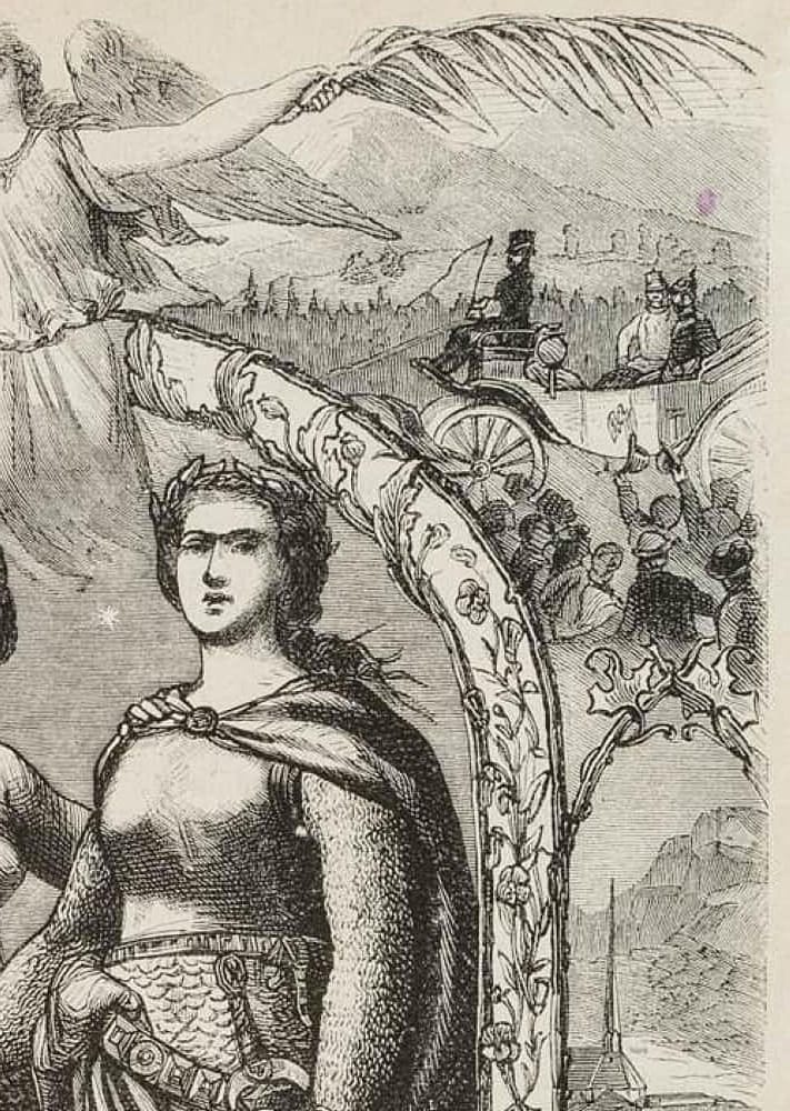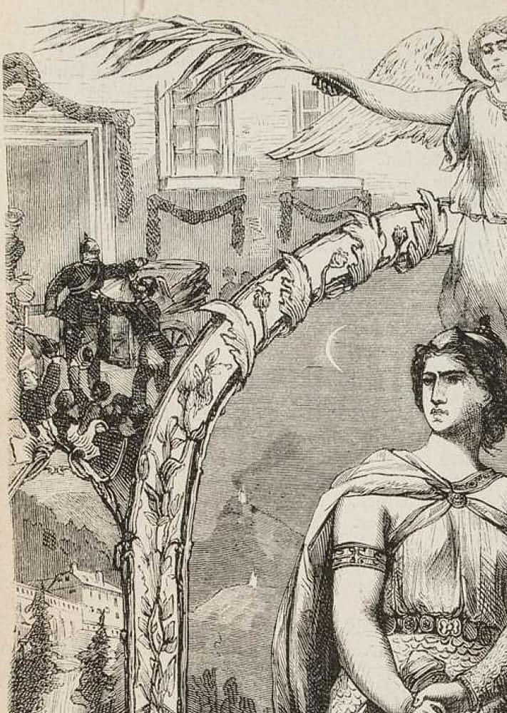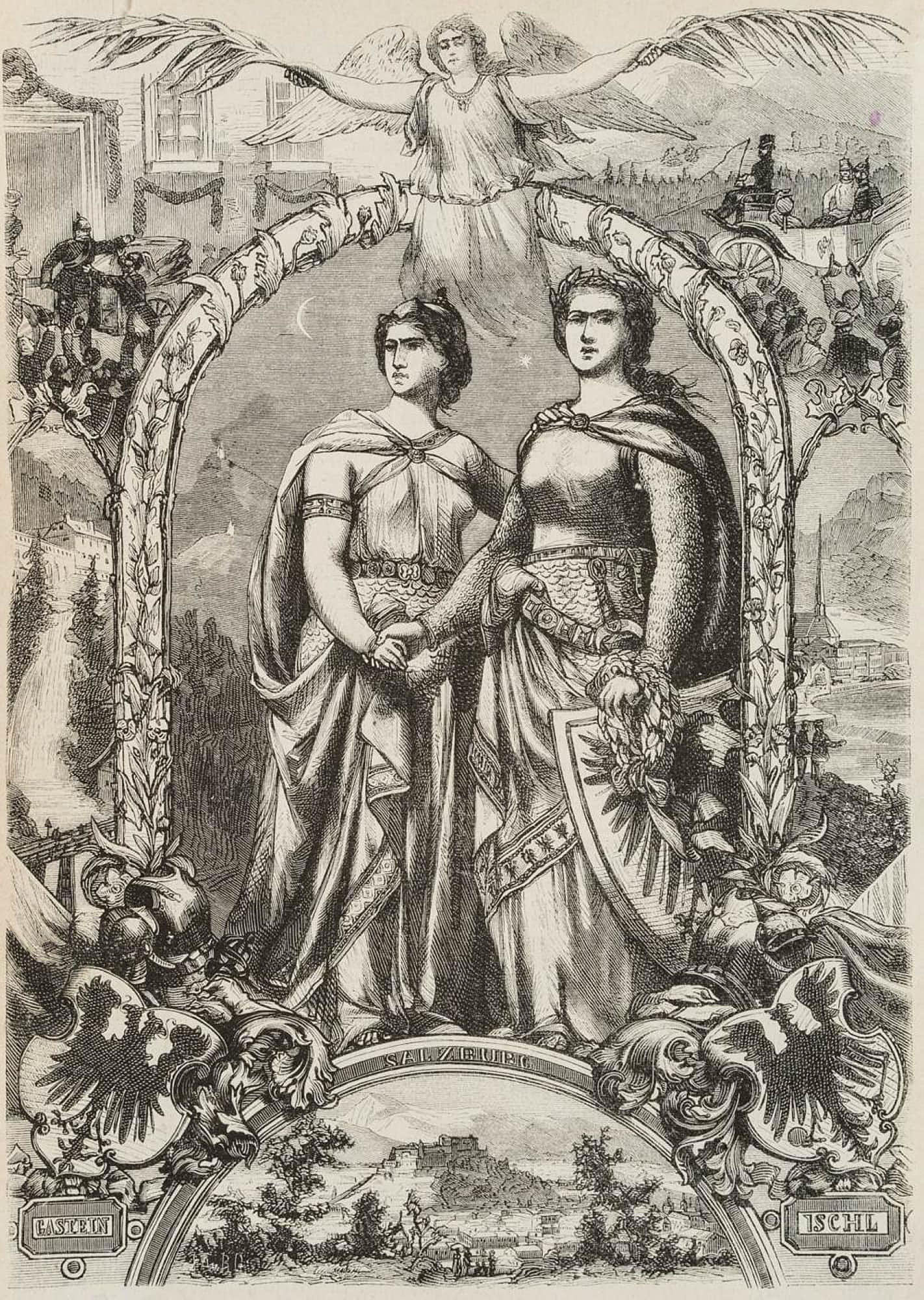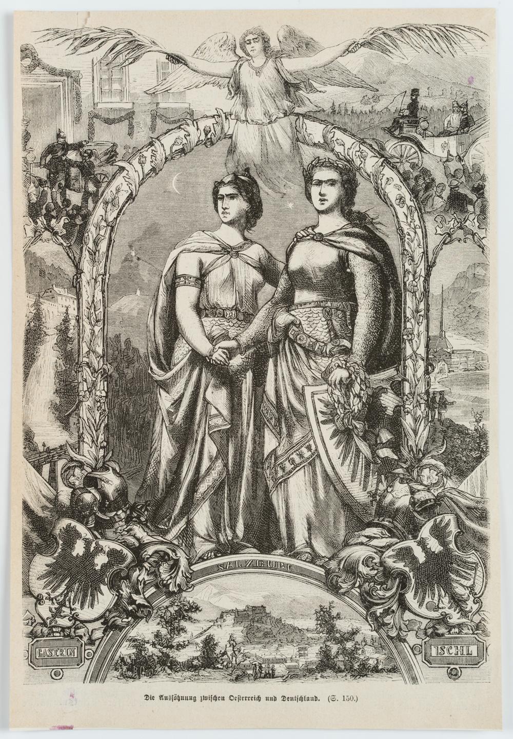 - Beschreibung: Die weiblichen Personifikationen der Nationen Österreich und des Deutschen Reiches reichen sich freundschaftlich die Hände. Seitlich sind Miniaturszenen mit Landschaft, Festungsarchitektur und königlichen Kutschen zu sehen. Das Blatt stammt aus der politisch-satirischen Zeitschrift “Kladderadatsch”. In Holz geschnitten von Richard Brend’amour (1831-1915).