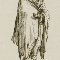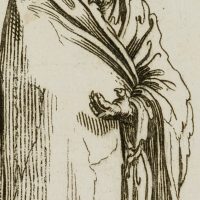 An etching from the series “The Beggars” by the French artist Jacques Callot, who was the most important graphic artist in France during his lifetime. He introduced numerous innovations in the art of etching. Depiction of a man with bare feet in a ragged robe; wrapped in a cloak, he stands in the open, holding out his right hand with long fingernails. - Date: 1622