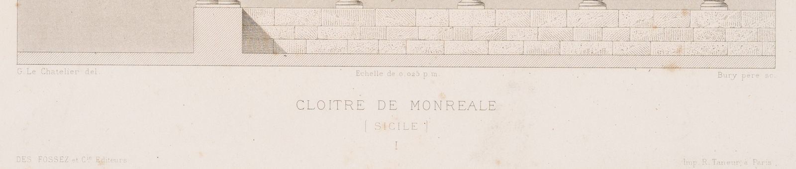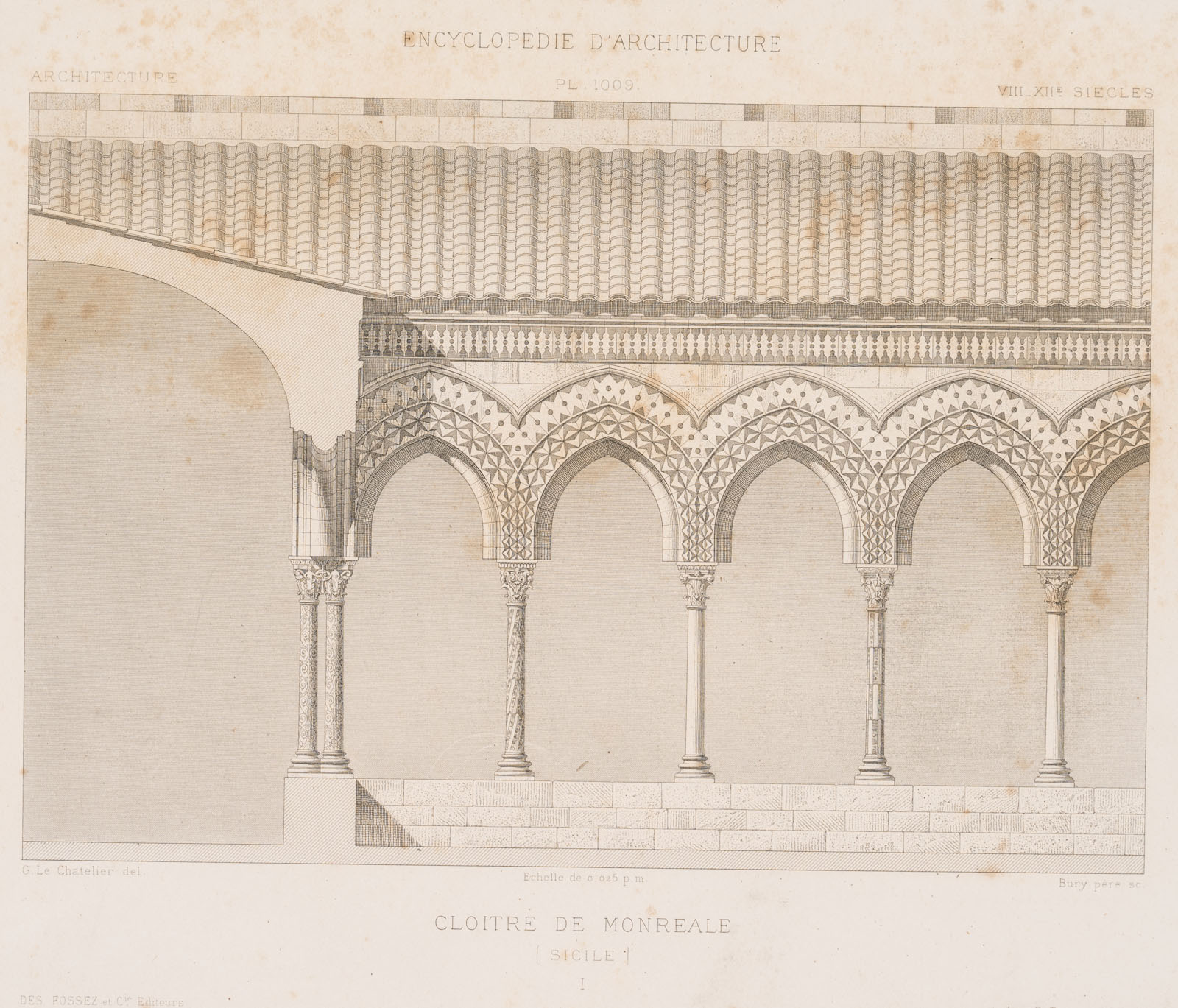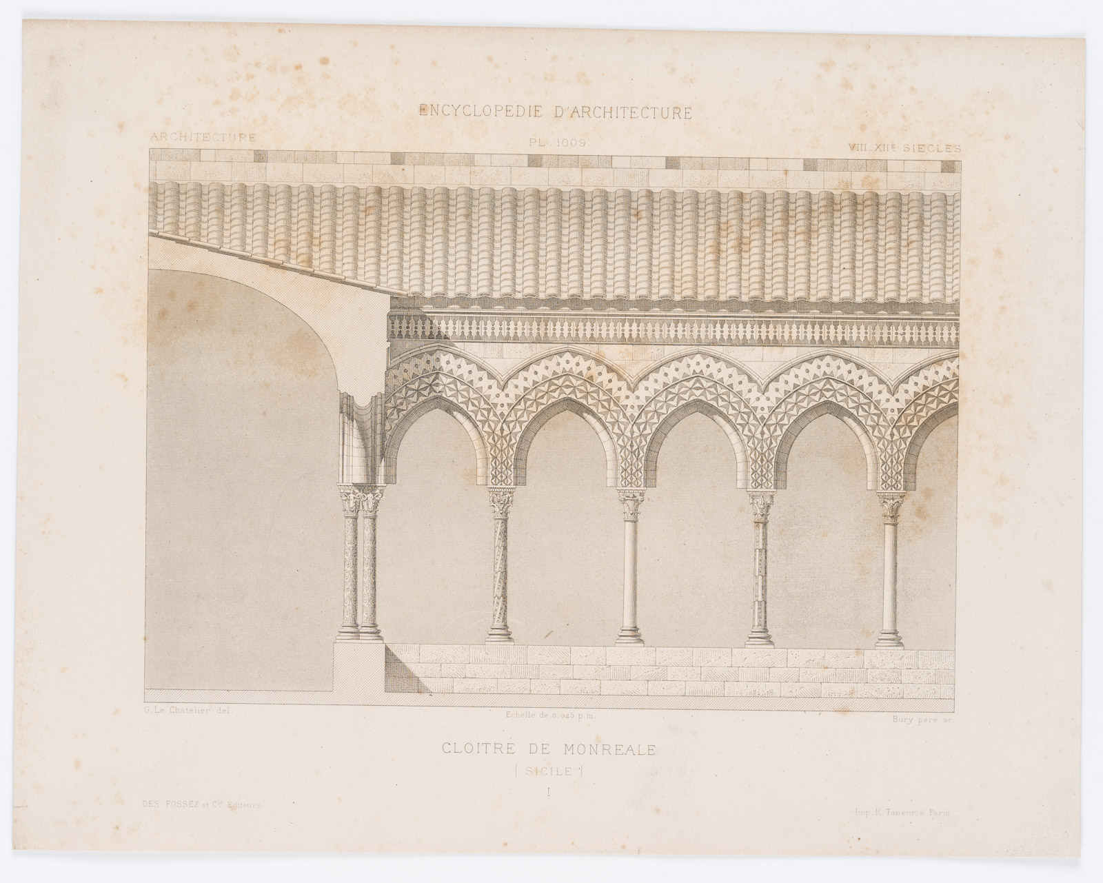 - Description: Sheet from the work ‘Encyclopedie d’Architecture’ ed. by Adolphe LANCE, published over the years 1813-1874. Inscribed above with the name of the encyclopaedia and below with “CLOITRE DE MONREALE (SICILE) I”. Numbered at the top centre with “PL. 1009”. Top right dated to the century “VIII XII SIECLES”.