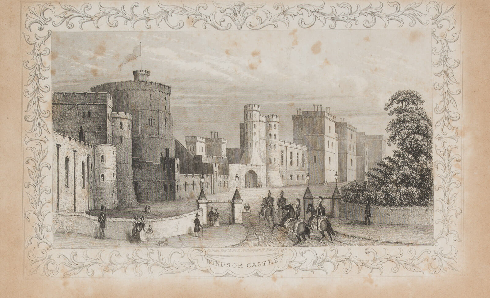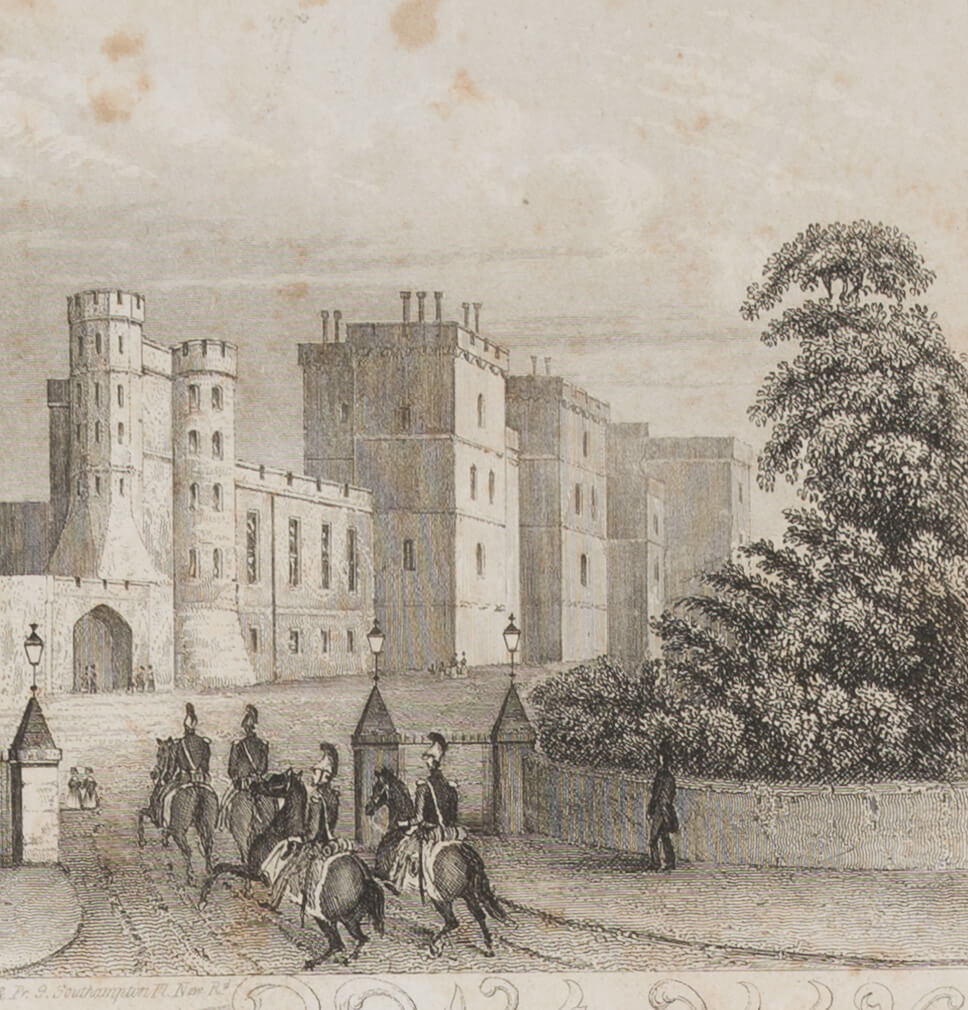 • Beschreibung: Ansicht des Windsor Castle, davor flanierende Adlige und reitende Soldaten.