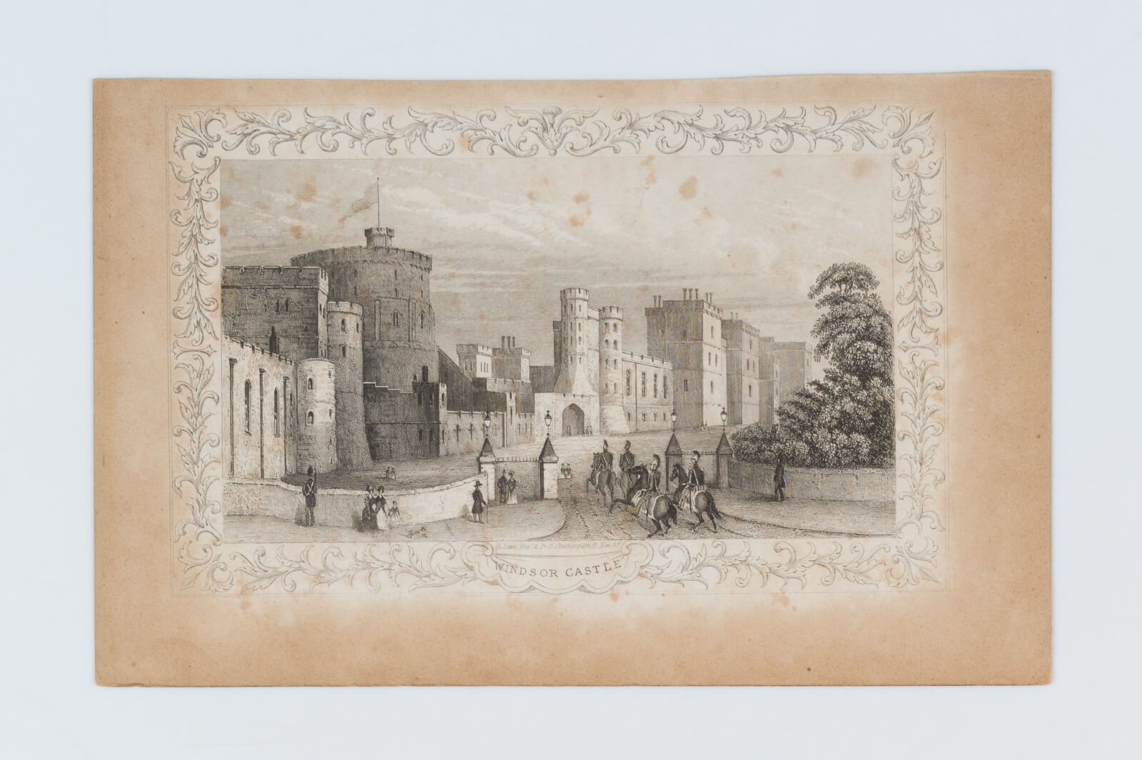 • Description: View of Windsor Castle, in front of it strolling noblemen and riding soldiers.