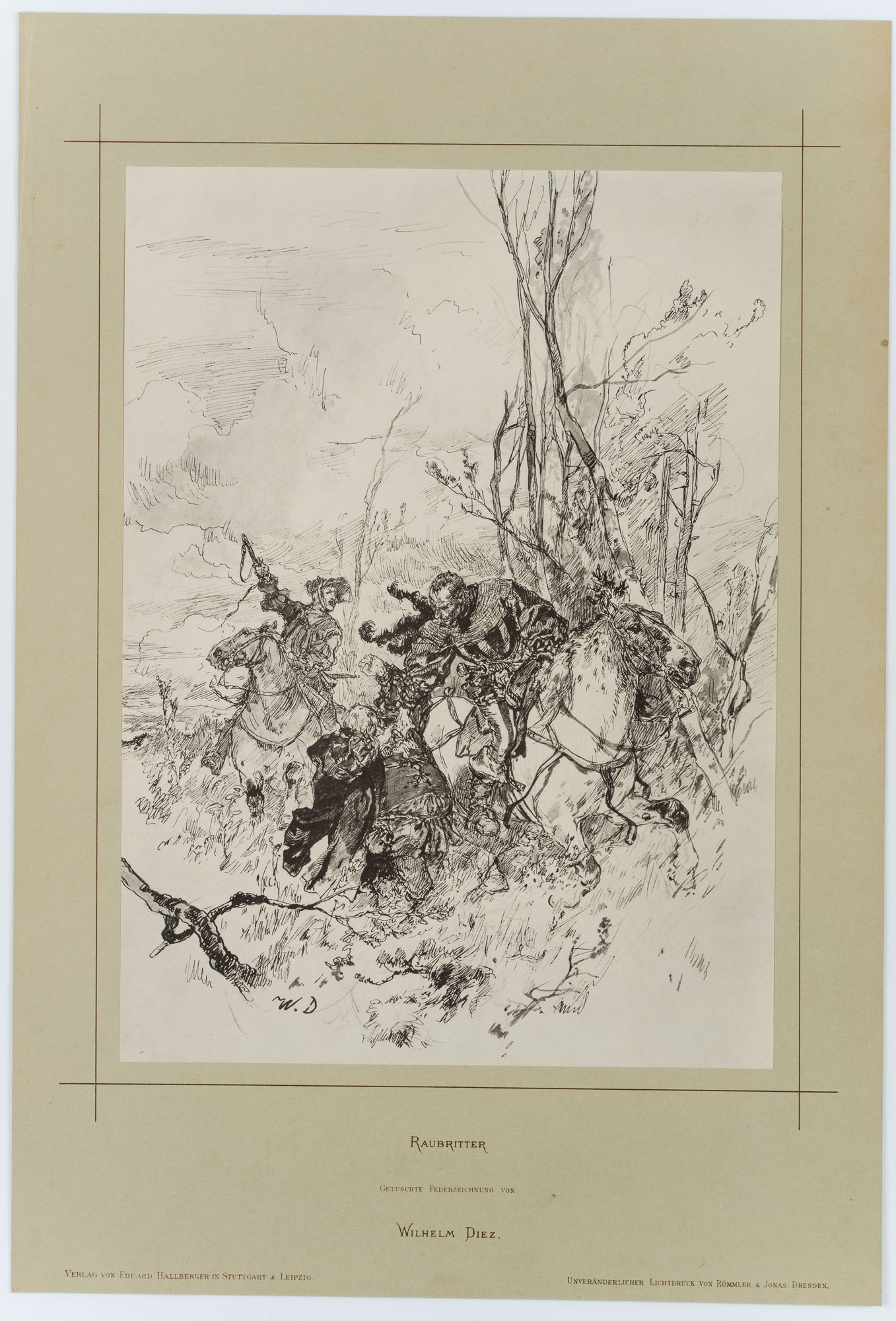 - Inscription: Monogrammed lower left in the image. Titled and inscribed “Verlag von Eduard Hallberger in Stuttgart & Leipzig. / Unveränderlicher Lichtdruck von Römmler & Jonas Dresden” at the bottom centre of the backing board.