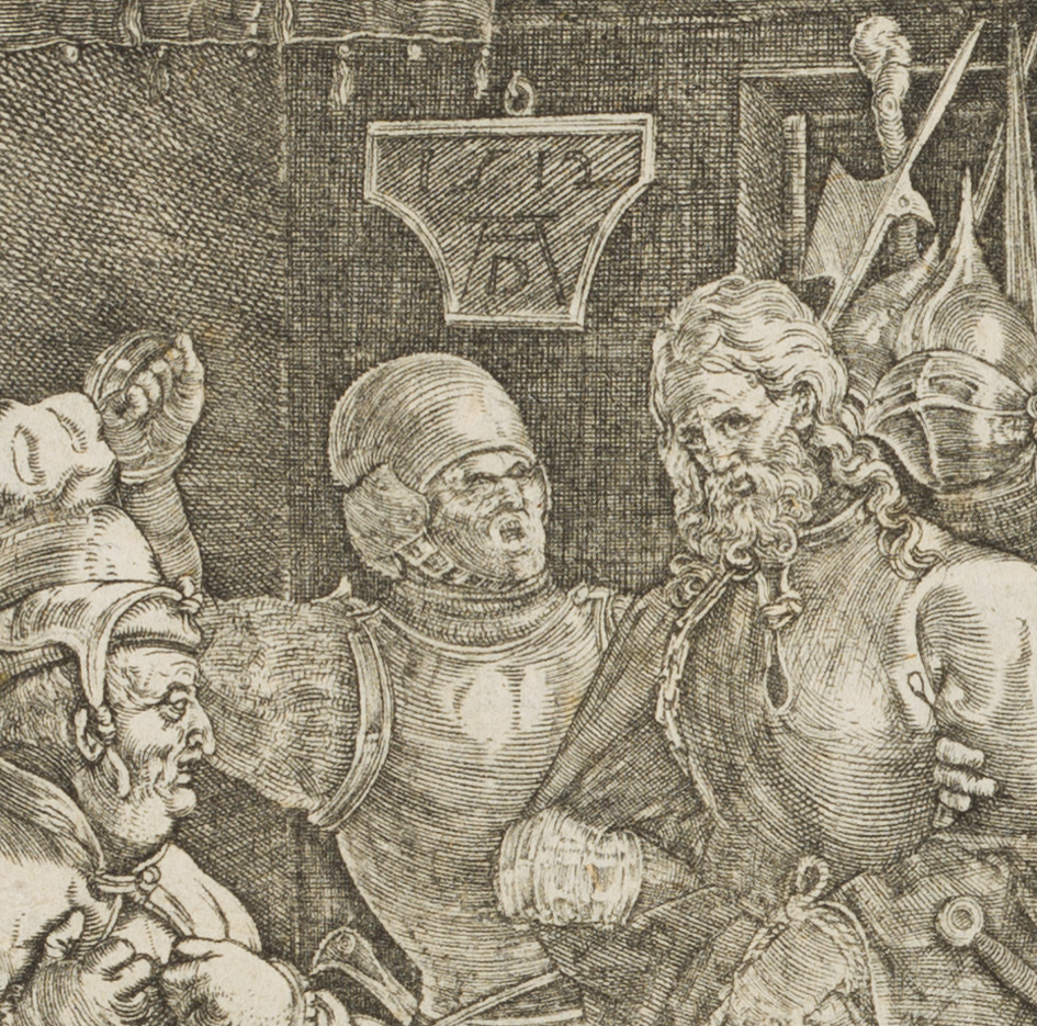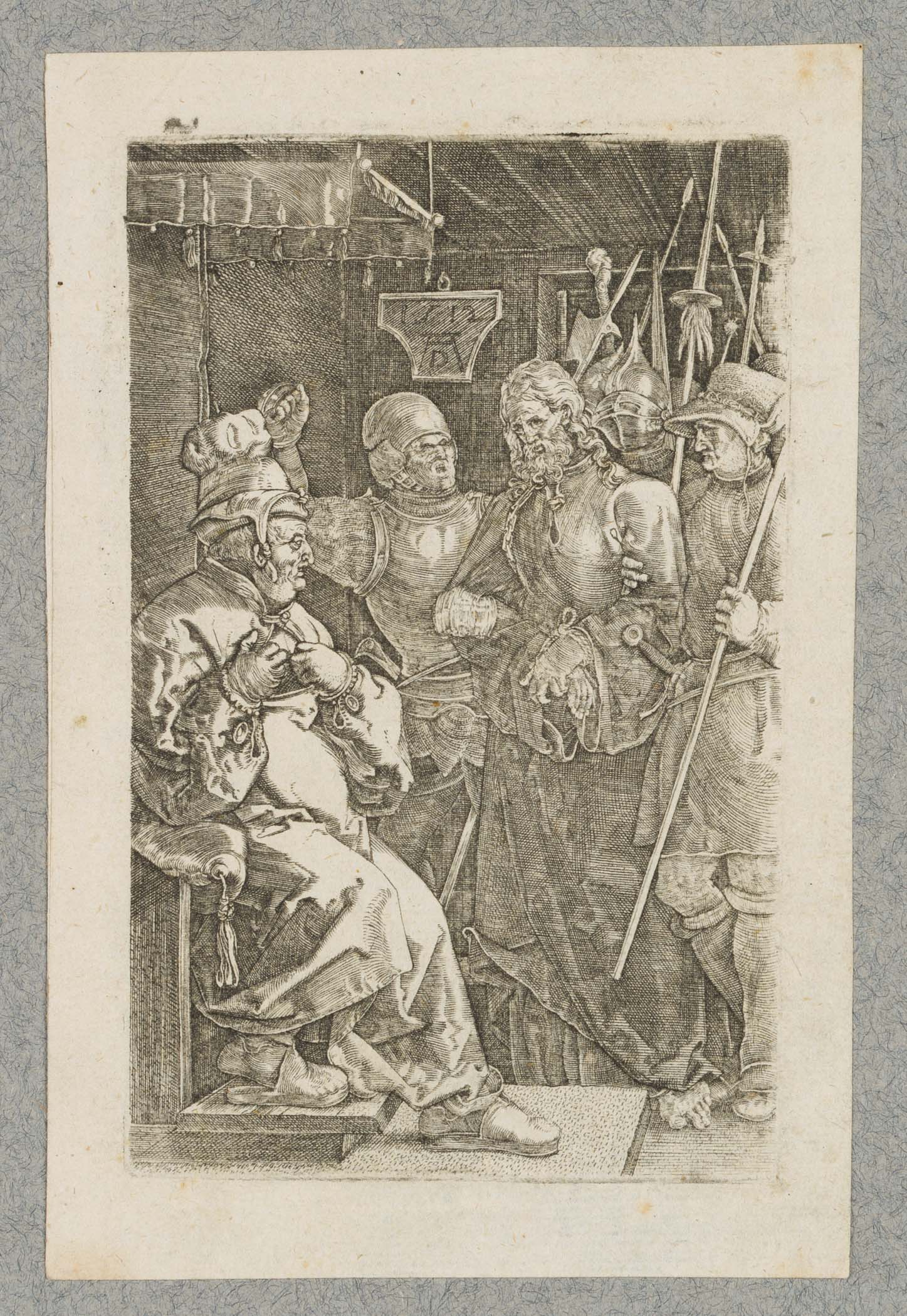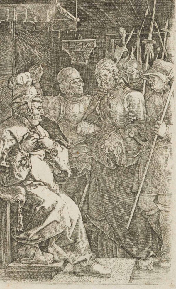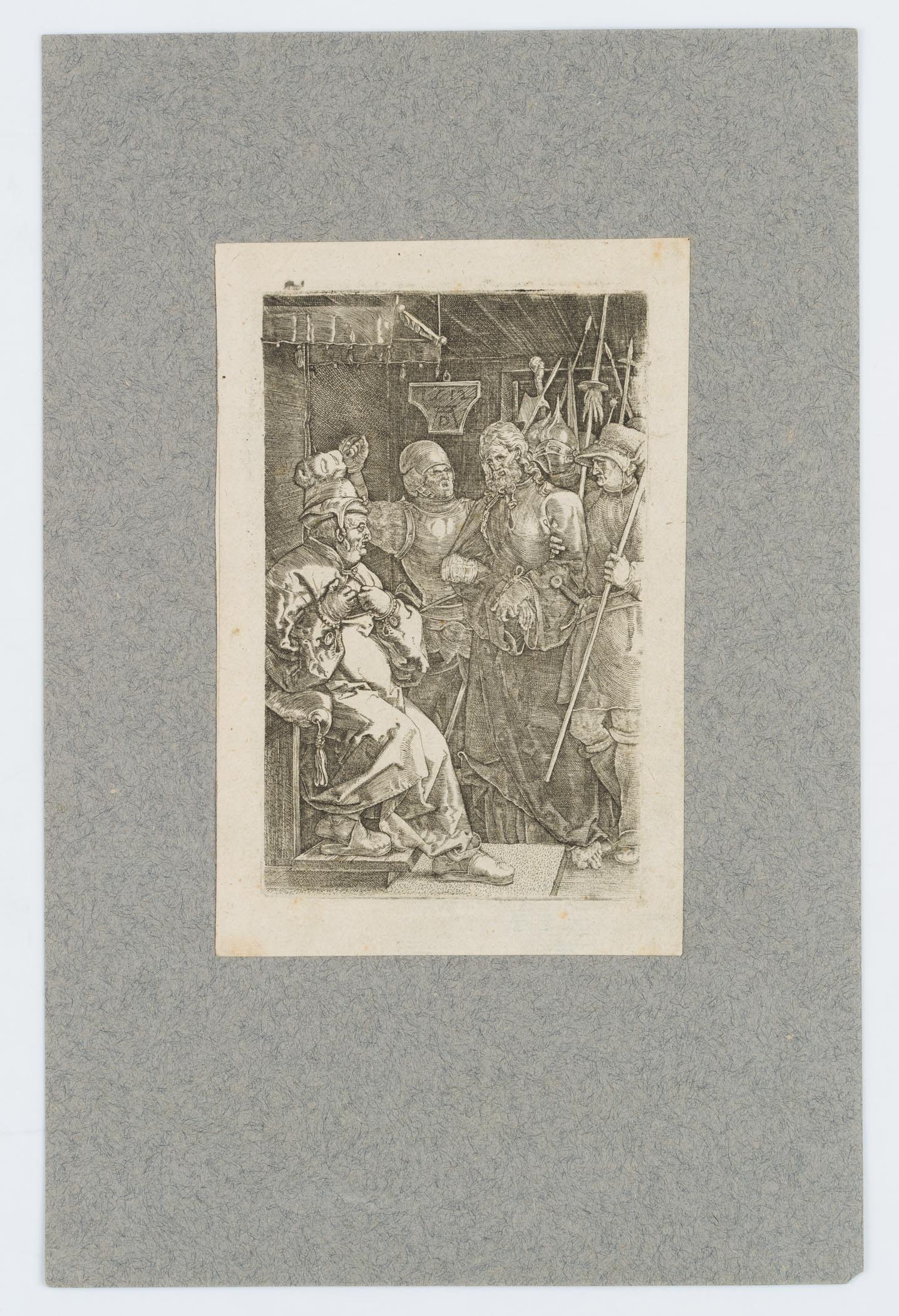 - Beschreibung: Kopie nach Dürers Blatt “Christus vor Kaiphas”, das 1512 als Teil der Kupferstich-Passion entstand, von der Gegenseite. Scherge führen den an den Händen gefesselten Christus vor den Hohepriester Kaiphas. Kaiphas überführt Christus der Gotteslästerung und zerreist dabei vor Wut sein Gewand. Zahlreiche Kopien belegen die Beliebtheit des bis dahin selten aufgegriffenen Motivs (vgl. Schoch I.134.48)