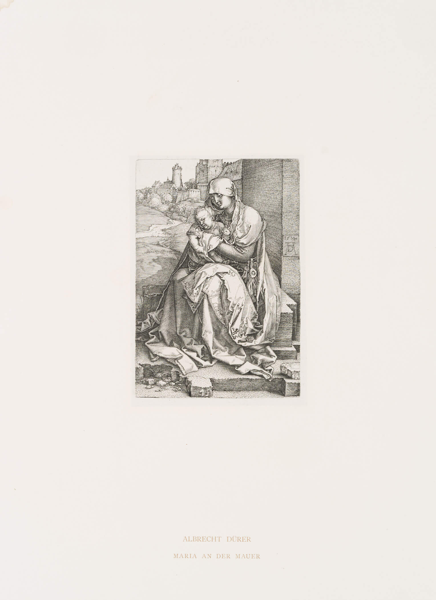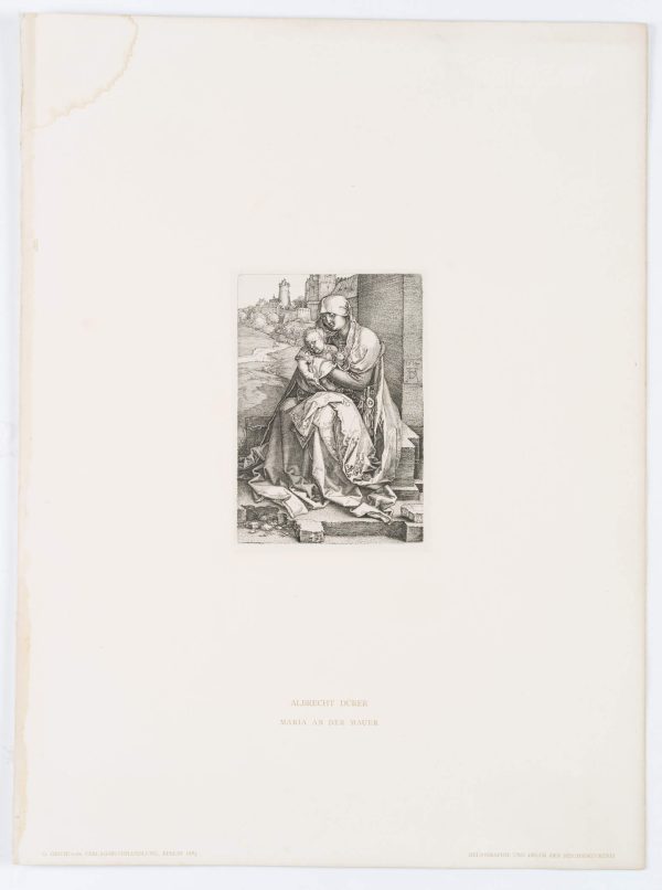 - Inscription: Lower middle inscribed in the printing plate: “Albrecht Dürer | Maria an der Mauer | G. Grote’sche Verlagsbuchhandlung, Berlin 1885 | Heliographie und Druck der Reichsdruckerei”.