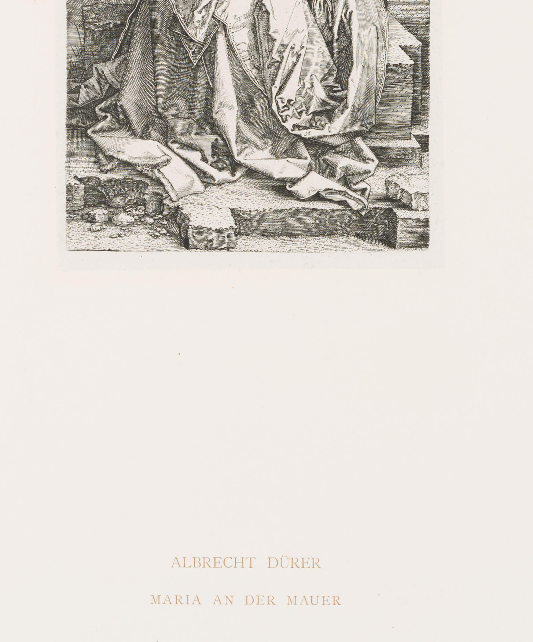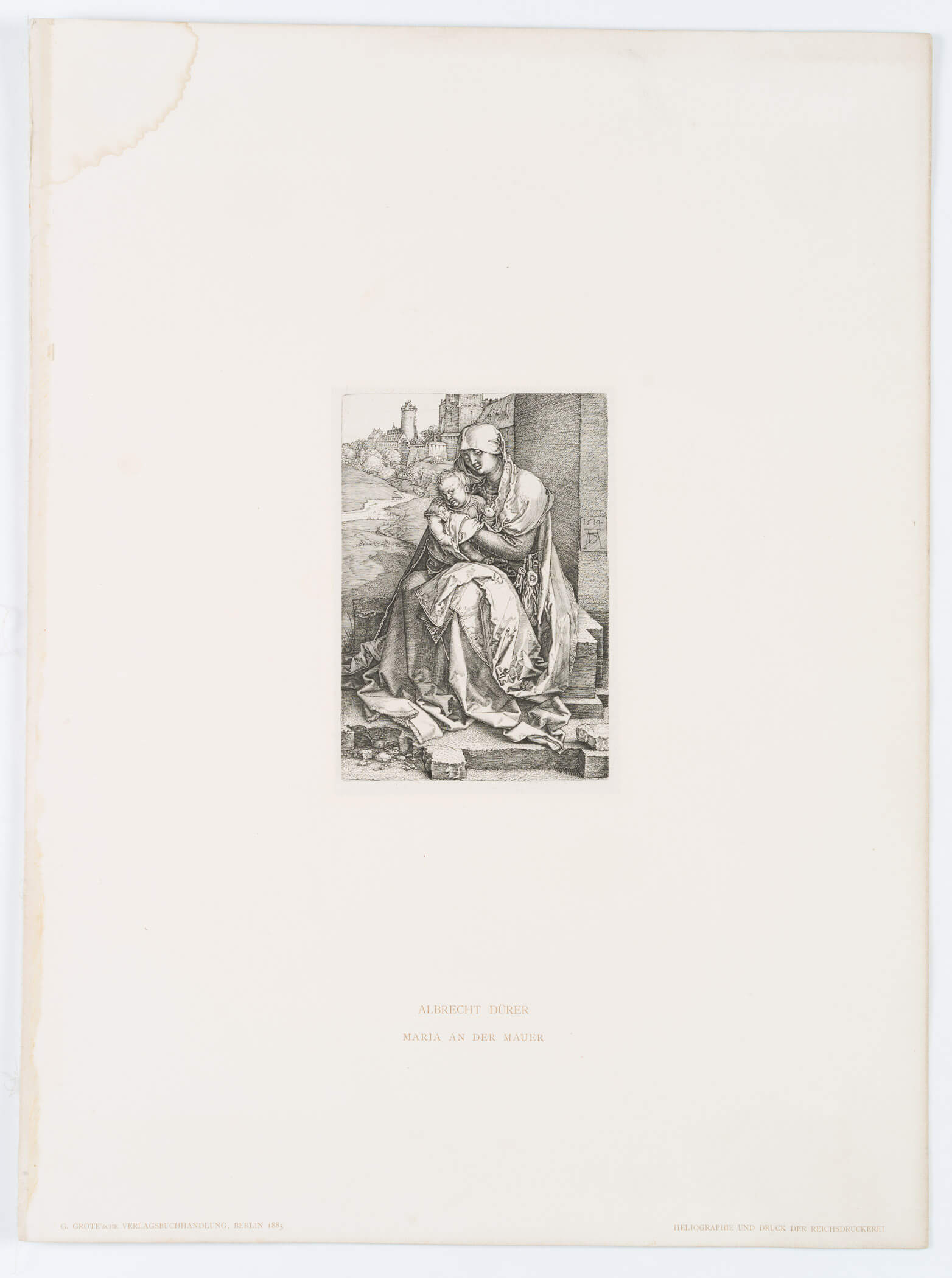 - Inscription: Lower middle inscribed in the printing plate: „Albrecht Dürer | Maria an der Mauer | G. Grote’sche Verlagsbuchhandlung, Berlin 1885 | Heliographie und Druck der Reichsdruckerei“.