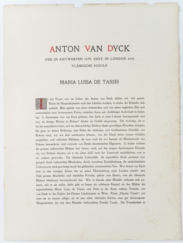 - Inscription: Signed on the left below the print with: “Van Dyck” and on the right with: “Collection Fürst Liechtenstein, Wien”. From the catalogue: Masterpieces of Painting. Old Masters. Reproductions in Photogravure. With a preface and accompanying text by Wilhelm Bode and Fritz Knapp, Berlin 1905. Please note further offers from the Masterpieces catalogue in our online shop. The photogravure is accompanied by the corresponding picture text by Wilhelm Bode on an additional sheet.