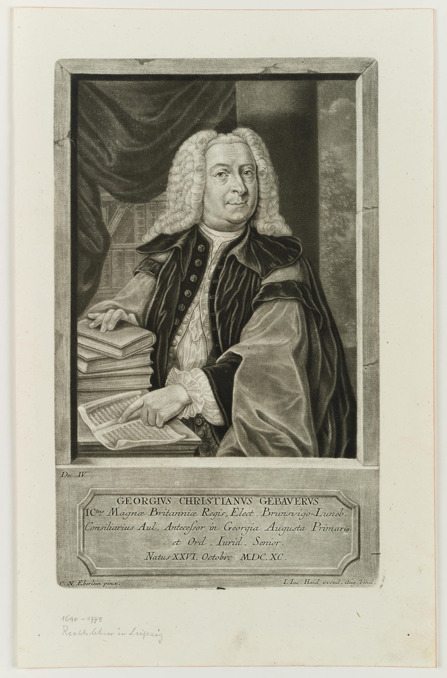 • Bezeichnung: Unten links im Druck signiert: “C.N. Eberlein pinx.”. Unten im Druck bezeichnet: “GEORGIUS CHRISTIANUS GEBAUERUS Ictus, Magnae Britanniae Regis, Elect. Brunsvigo-Luneb. Consiliarius Aul. Antecessor in Georgia Augusta Primaris et ord. Iurid. Senior. Natus XXVI. Octobr. MDC.XC”. Mittig links weitere Beschriftungen: “Dec. IV.”. Unten rechts zusätzliche Beschriftung: “I.Iac. Haid excud. Aug. Vind.”.