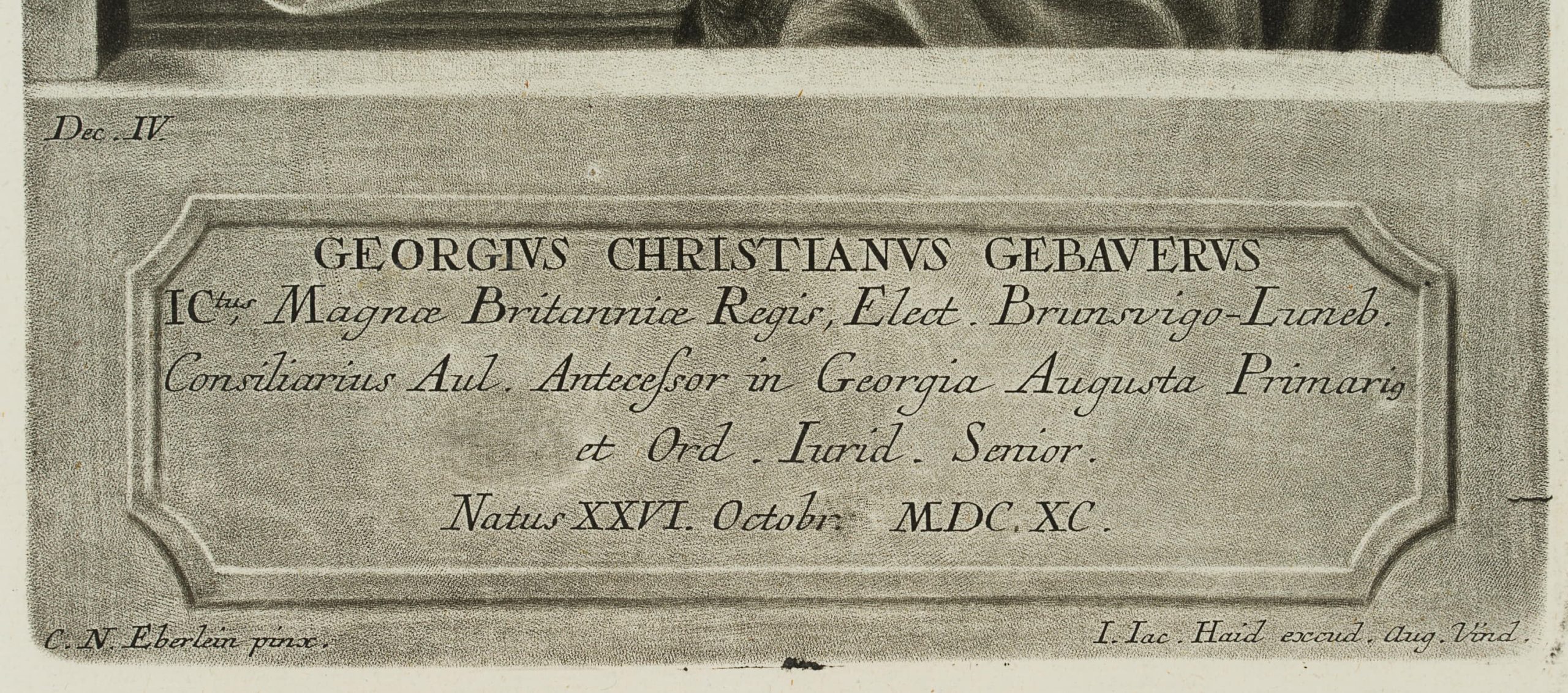 • Inscription: lower left signed in the printing plate: “C.N. Eberlein pinx.”. At the lower part inscribed in the printing plate: “GEORGIUS CHRISTIANUS GEBAUERUS Ictus, Magnae Britanniae Regis, Elect. Brunsvigo-Luneb. Consiliarius Aul. Antecessor in Georgia Augusta Primaris et ord. Iurid. Senior. Natus XXVI. Octobr. MDC.XC”. Middle left further inscription: “Dec. IV.”. Lower right additional inscription: “I.Iac. Haid excud. Aug. Vind.”.