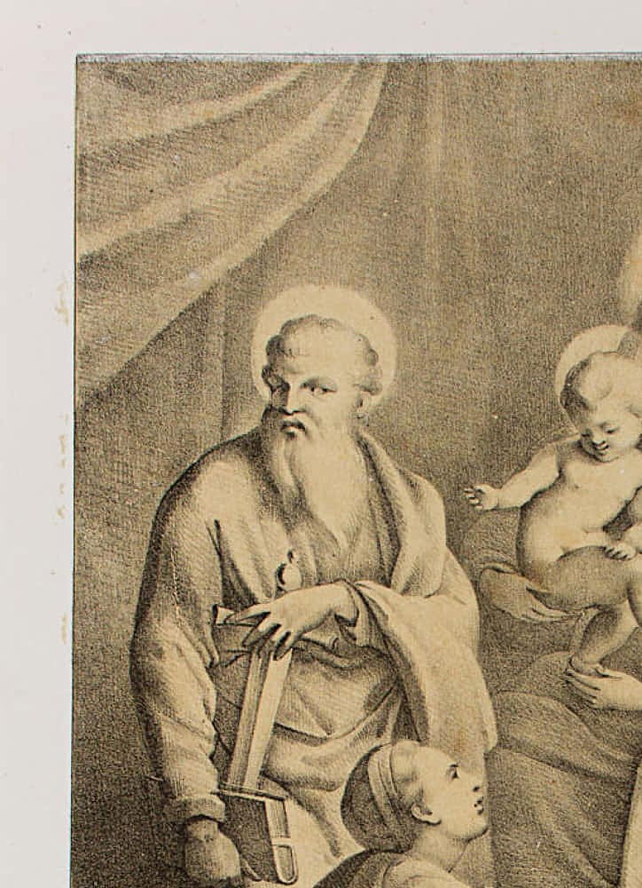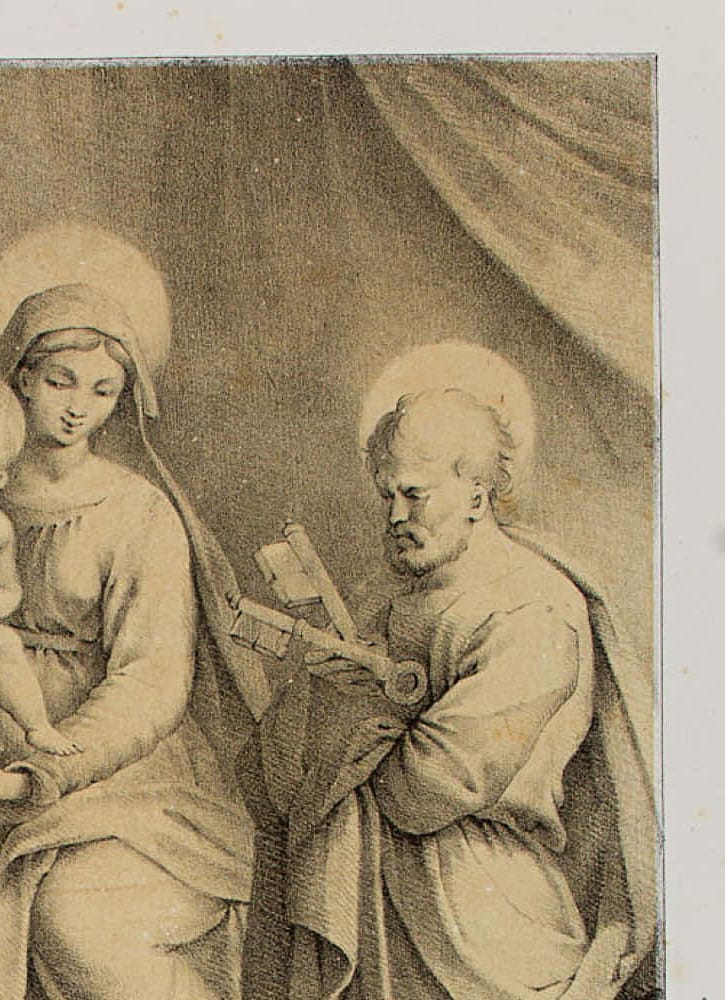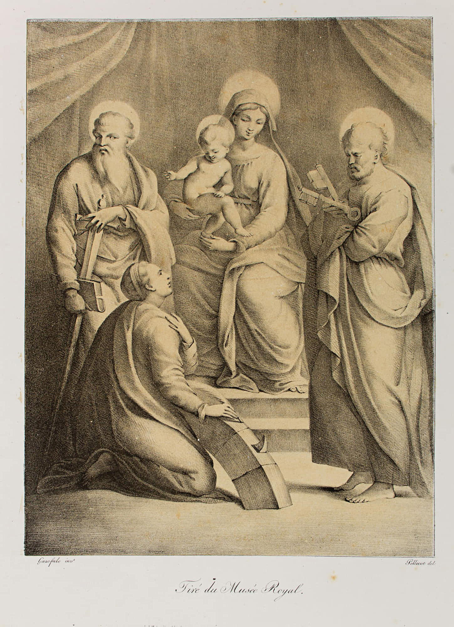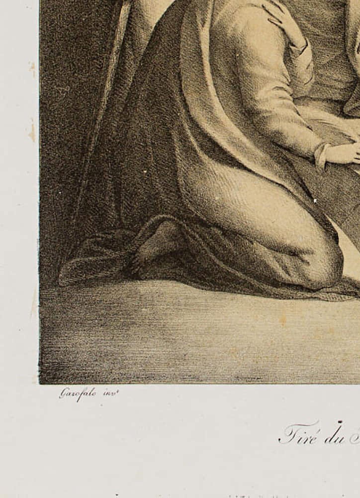 - Description: Joseph and Our Lady with Jesus”, colour lithograph of a work by Garofalo Benvenuto 1481-1559. From the series: Pictures of the Romanesque School (Ecole de Florence). Inscribed: Tire du Musee Royal. Garofalo inv Pellicot del.