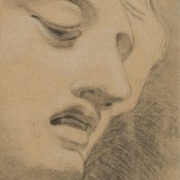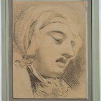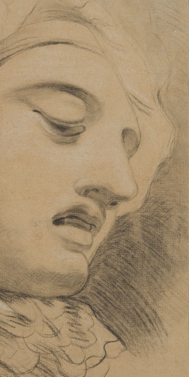- Beschreibung: Die Darstellung ist angelehnt an Jean-Baptiste Greuze Kopfportrait einer Schlafenden. Wie im vorliegenden Portrait zeigte Greuze seine Ehefrau im Moment des Schlafes mit leicht geöffnetem Mund, geschlossenen Augen und Locken, die aus der Haube fallen. In unserem wie in dem von Greuze sind die Gesichtszüge weich und fein gezeichnet, das Kleid und der Hintergrund hingegen in kräftigen, frei geführten Strichen angelegt.